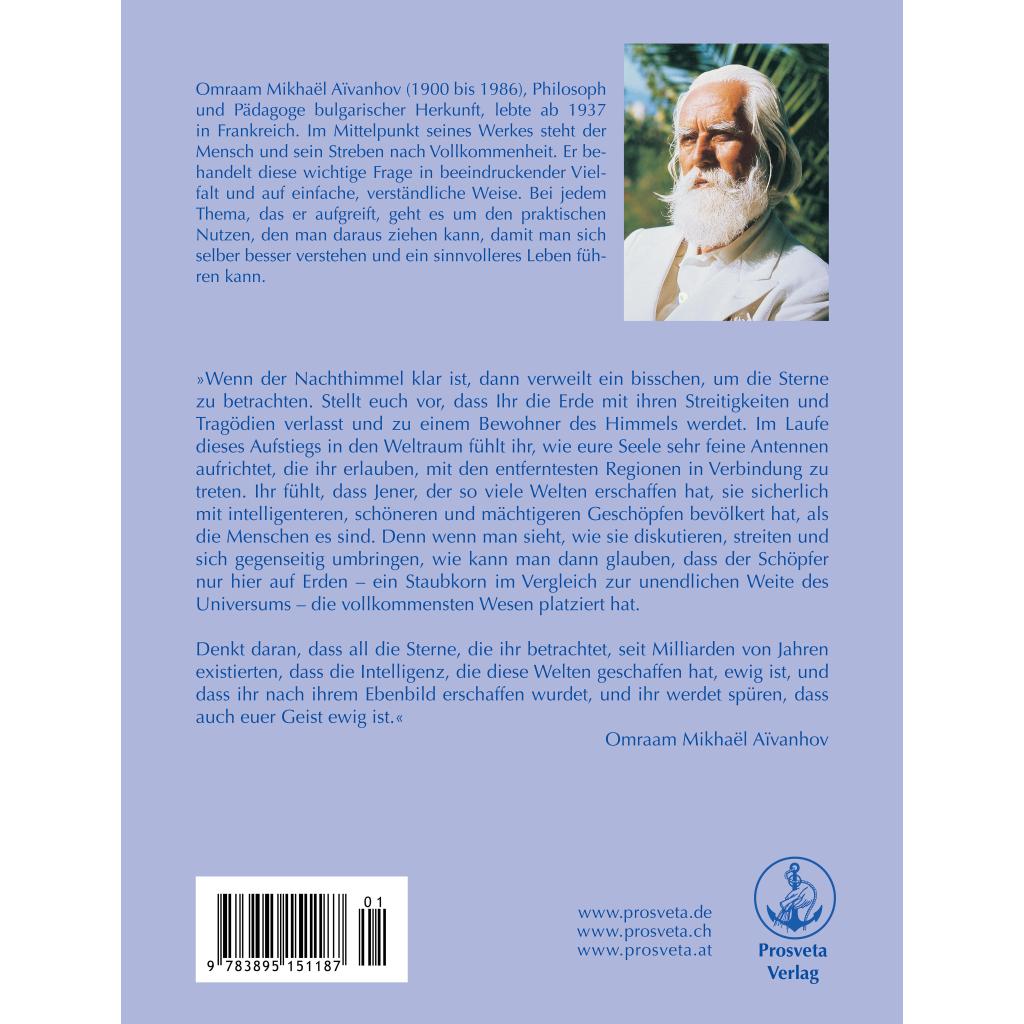 'Wenn der Nachthimmel klar ist, dann verweilt ein bisschen, um die Sterne zu betrachten. Stellt euch vor, dass Ihr die Erde mit ihren Streitigkeiten und Tragödien verlasst und zu einem Bewohner des Himmels werdet. Im Laufe dieses Aufstiegs in den Weltraum fühlt ihr, wie eure Seele sehr feine Antennen aufrichtet, die ihr erlauben, mit den entferntesten Regionen in Verbindung zu treten. Ihr fühlt, dass Jener, der so viele Welten erschaffen hat, sie sicherlich mit intelligenteren, schöneren und mächtigeren Geschöpfen bevölkert hat, als die Menschen es sind. Denn wenn man sieht, wie sie diskutieren, streiten und sich gegenseitig umbringen, wie kann man dann glauben, dass der Schöpfer nur hier auf Erden - ein Staubkorn im Vergleich zur unendlichen Weite des Universums - die vollkommensten Wesen platziert hat. Denkt daran, dass all die Sterne, die ihr betrachtet, seit Milliarden von Jahren existierten, dass die Intelligenz, die diese Welten geschaffen hat, ewig ist, und dass ihr nach ihrem Ebenbild erschaffen wurdet, und ihr werdet spüren, dass auch euer Geist ewig ist.' Omraam Mikhaël Aïvanhov