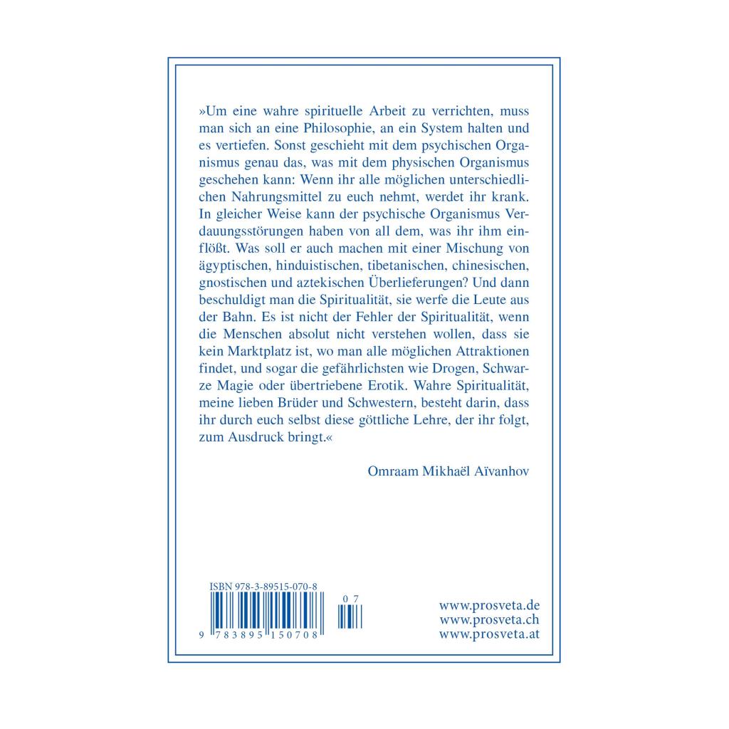 'Um eine wahre spirituelle Arbeit zu verrichten, muss man sich an eine Philosophie, an ein System halten und es vertiefen. Sonst geschieht mit dem psychischen Organismus genau das, was mit dem physischen Organismus geschehen kann: Wenn ihr alle möglichen unterschiedlichen Nahrungsmittel zu euch nehmt, werdet ihr krank. In gleicher Weise kann der psychische Organismus Verdauungsstörungen haben von all dem, was ihr ihm einflößt. Was soll er auch machen mit einer Mischung von ägyptischen, hinduistischen, tibetanischen, chinesischen, gnostischen und aztekischen Überlieferungen? Und dann beschuldigt man die Spiritualität, sie werfe die Leute aus der Bahn. Es ist nicht der Fehler der Spiritualität, wenn die Menschen absolut nicht verstehen wollen, dass sie kein Marktplatz ist, wo man alle möglichen Attraktionen findet, und sogar die gefährlichsten wie Drogen, Schwarze Magie oder übertriebene Erotik. Wahre Spiritualität, meine lieben Brüder und Schwestern, besteht darin, dass ihr durch euch selbst diese göttliche Lehre, der ihr folgt, zum Ausdruck bringt.' Omraam Mikhaël Aïvanhov