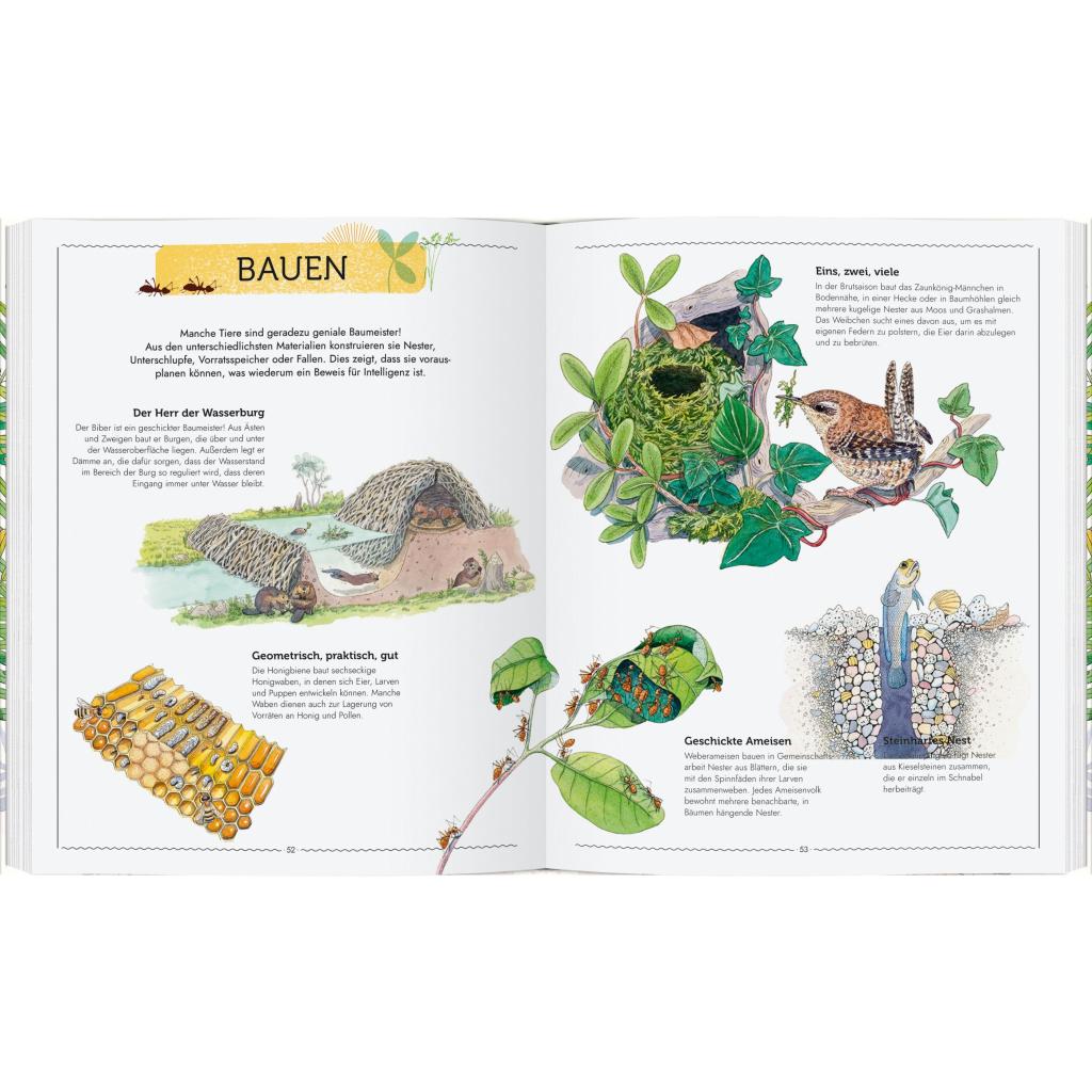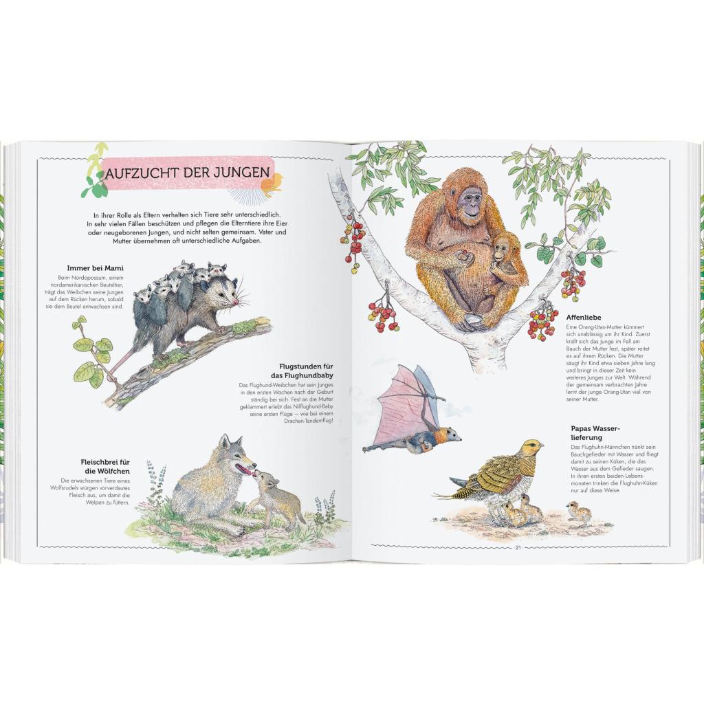Dieses großformatige und reich bebilderte Buch bietet faszinierende Einblicke in die unterschiedlichsten Bereiche der Tierwelt: von der Fortpflanzung über die Geburt, das Aufwachsen, Fressen, Spielen, Kommunizieren, Kämpfen und Schlafen bis hin zum Tod. Dabei erfahren wir viel Staunenswertes, Unterhaltsames und Berührendes: Zum Beispiel, dass der in Südostasien lebende Rotstirnschneidervogel seinen Schnabel und Spinnfäden benutzt, um Blätter zu einem Nest zusammenzunähen. Oder dass Igelmännchen tanzen, um das Herz des Igelweibchens zu gewinnen, und dass bei Seesternen abgebrochene Arme wieder nachwachsen. Mit wunderschönen und realistischen Illustrationen - beinahe so lebendig wie die Tiere selbst!