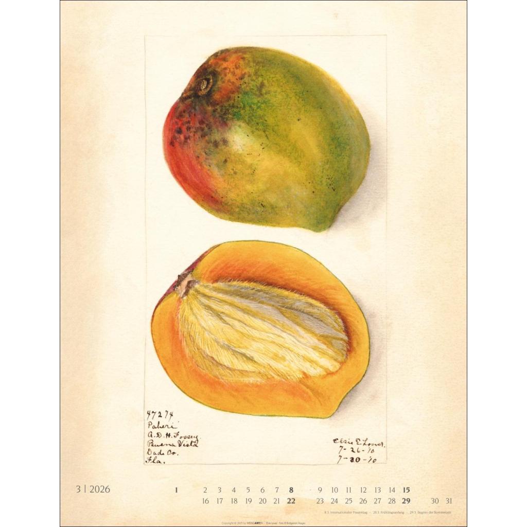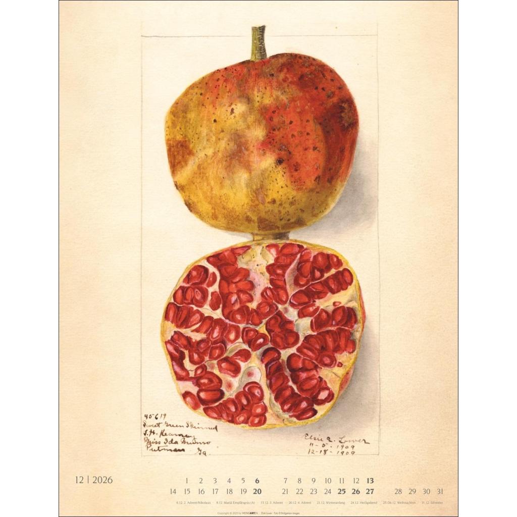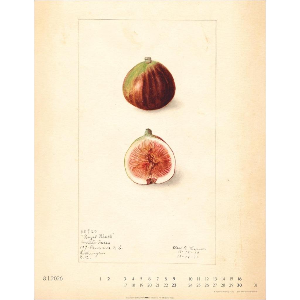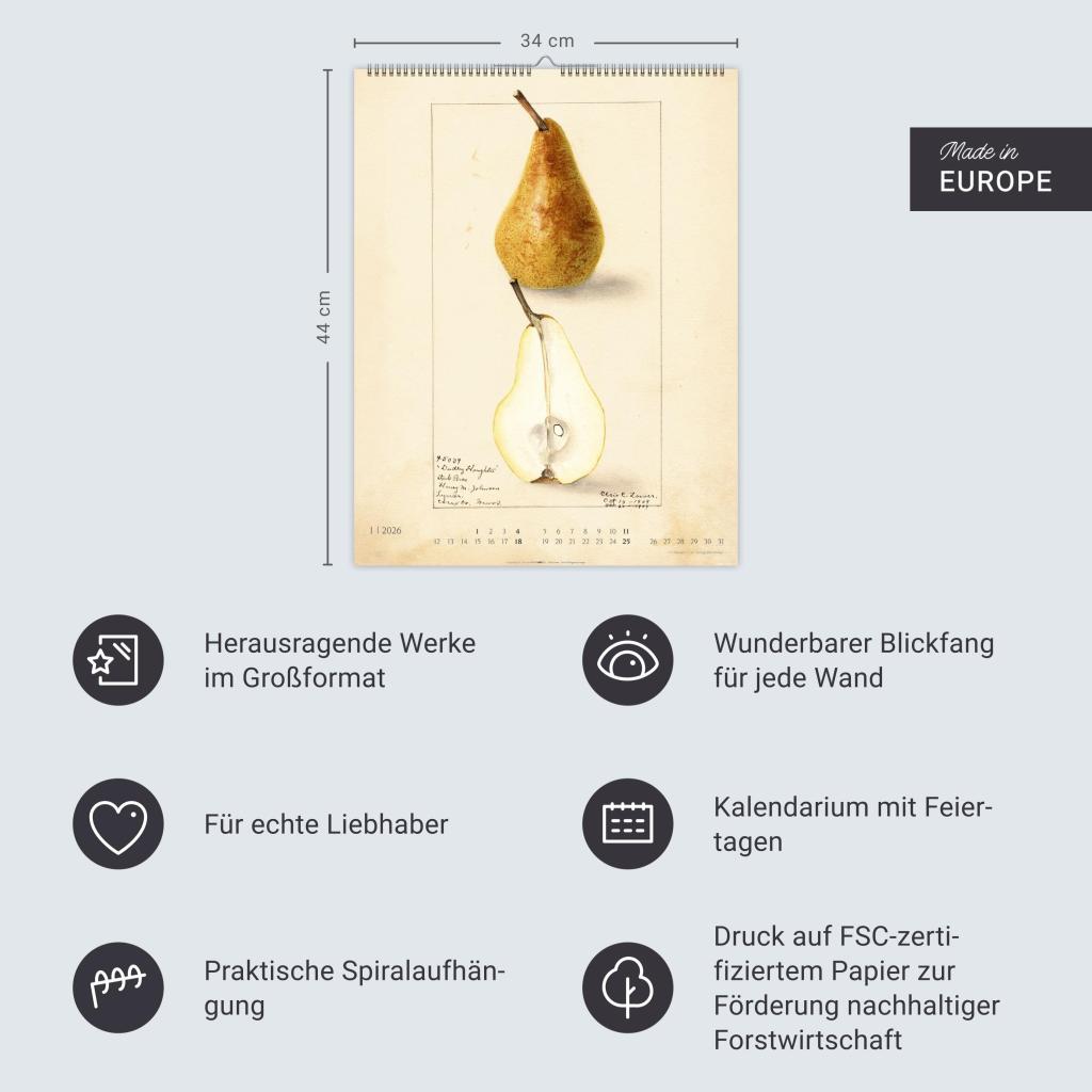 Dekorativer Wandkalender mit historischen Zeichnungen. Die Klassiker im Obstgarten in Szene gesetzt: Natur- und Food-Kalender im Format 34 x 44 cm