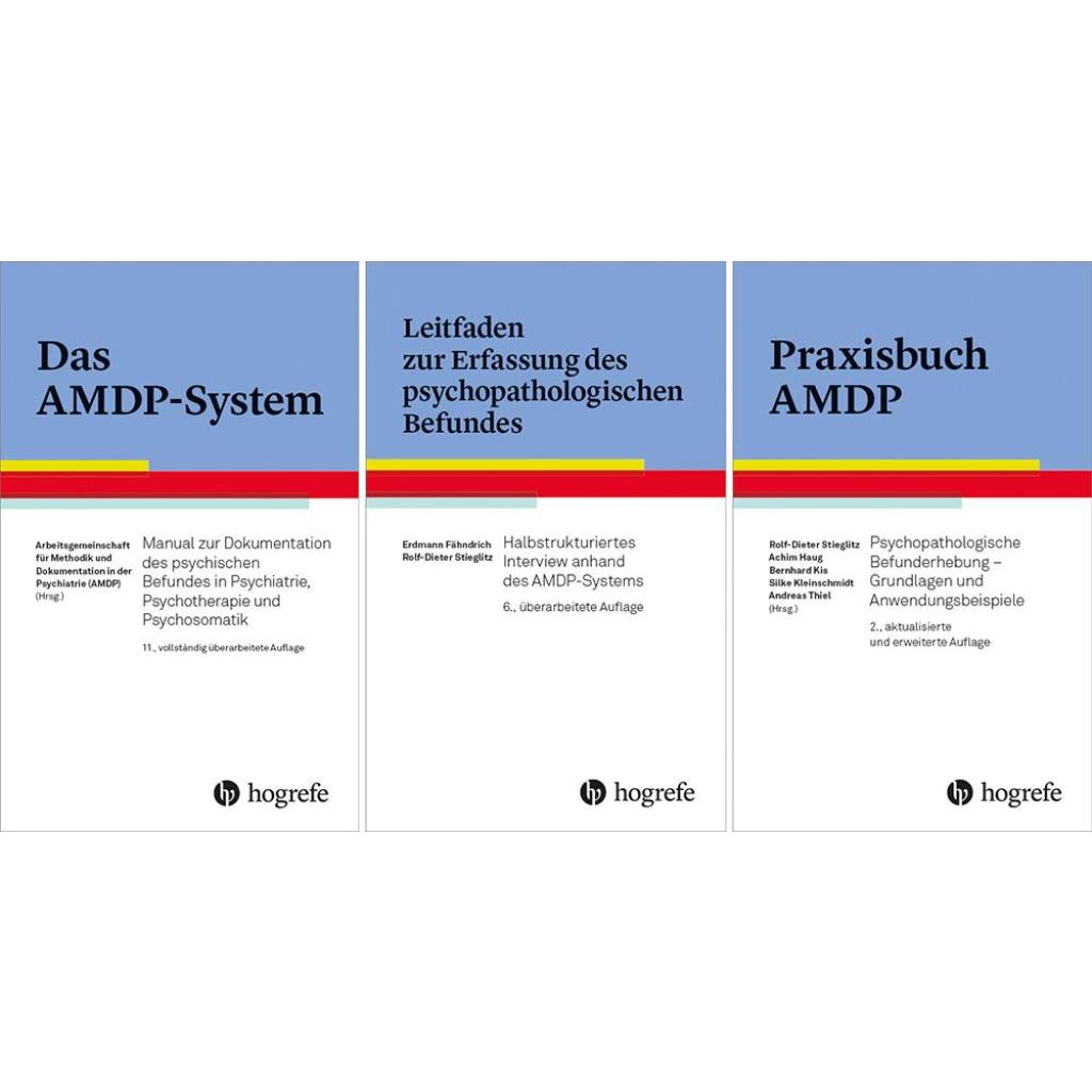 Es umfasst folgende Titel: ¿ AMDP (Hrsg.): Das AMDP-System. Manual zur Dokumentation des psychischen Befundes in Psychiatrie, Psychotherapie und Psychosomatik, 11., vollständig überarbeitete Auflage 2023 (978-3-8017-3157-1) ¿ Fähndrich/Stieglitz: Leitfaden zur Erfassung des psychopathologischen Befundes. Halbstrukturiertes Interview anhand des AMDP-Systems, 6., überarbeitete Auflage 2023 (978-3-8017-3114-4) ¿ Stieglitz/Haug/Kis/Kleinschmidt/Thiel (Hrsg.): Praxisbuch AMDP. Psychopathologische Befunderhebung - Grundlagen und Anwendungsbeispiele, 2., aktualisierte und erweiterte Auflage 2023 (978-3-8017-3160-1)