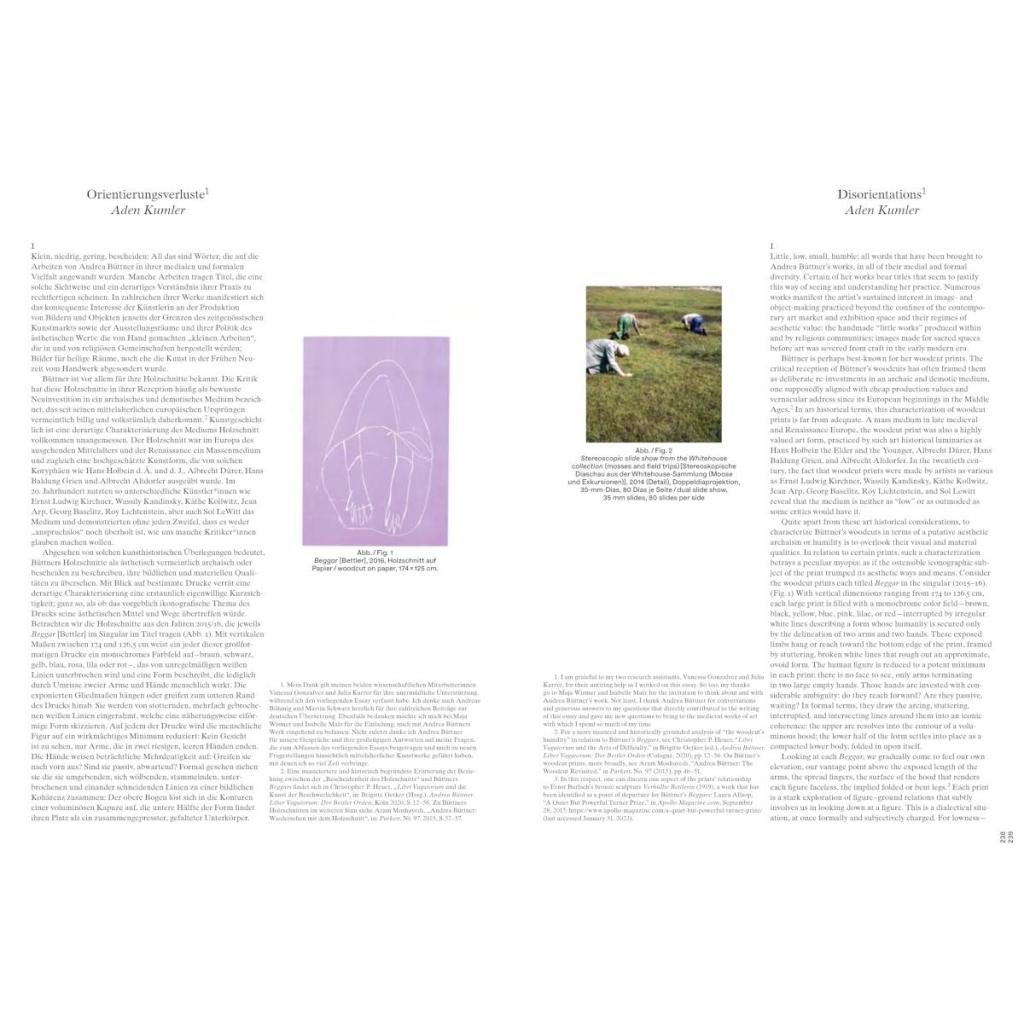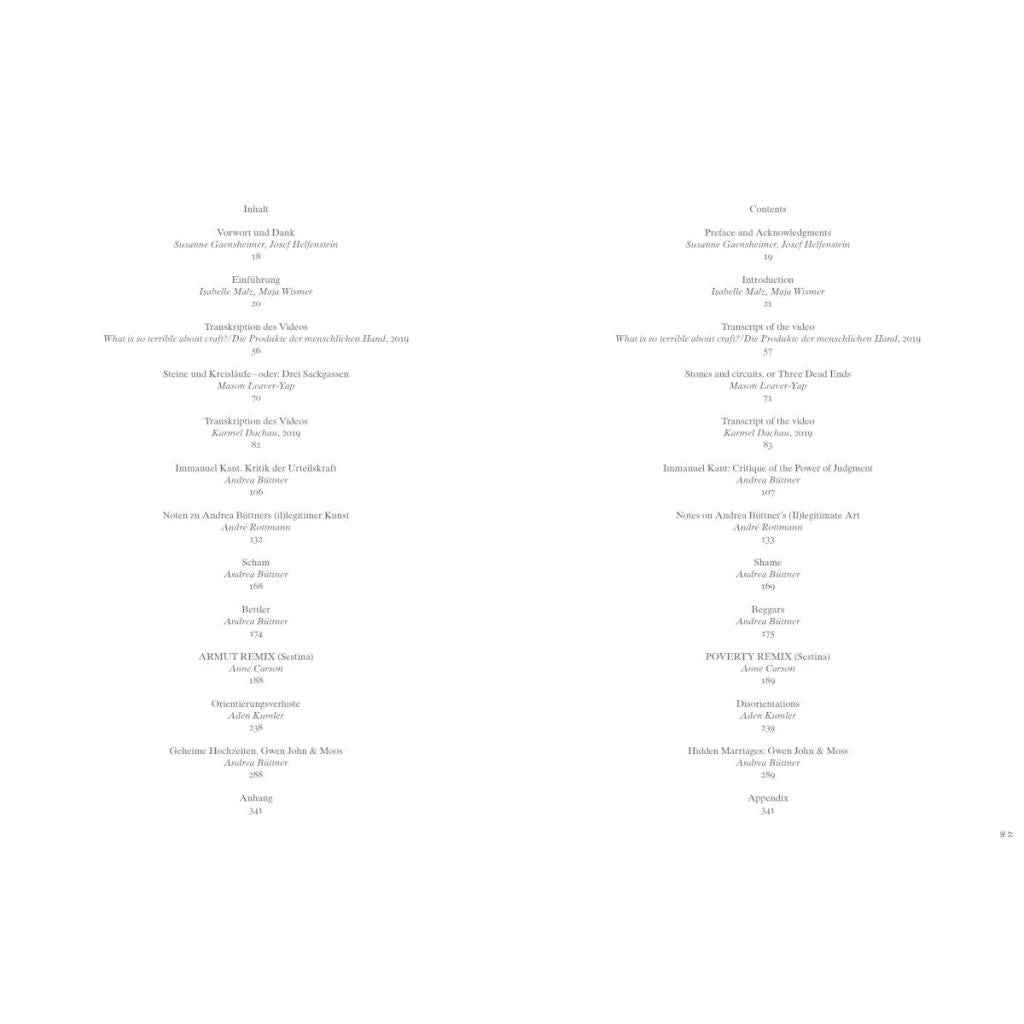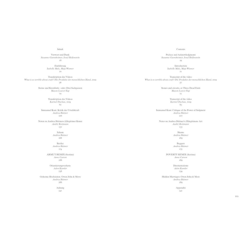 Andrea Büttner verbindet in ihrer künstlerischen Praxis Kunstgeschichte mit sozialen und ethischen Fragen. Seit den frühen 2000er-Jahren schafft die international renommierte Künstlerin Bilder zu Themen wie Arbeit, Armut, Scham und Fürsorge in klösterlichen Formen des Zusammenlebens, aber auch zum Kunsthandwerk als politisches Feld. Zur Sichtbarmachung dieser Themen, die sie immer wieder hinsichtlich ihres Spannungsverhältnisses von Ästhetik und Ethik untersucht, verwendet sie eine große Fülle von künstlerischen Ausdrucksmitteln. Bekannt geworden durch großformatige Holzschnitte erweiterte Büttner ihre künstlerischen Medien seither um eine Vielzahl. Dazu gehören, neben Radierungen, Malerei, Fotografien unter anderem Videoinstallationen, Bücher, Glasobjekte und Textilien. Für Ausstellungen und Publikationen verknüpft Büttner ihre Werke zu thematischen Gruppen und inszeniert diese als sinnliche »Erzählungen«, die sich sukzessive erschließen lassen. ANDREA BÜTTNER (*1972, Stuttgart) studierte Bildende Kunst, Philosophie und Kunstgeschichte in Tübingen und Berlin und promovierte 2010 zum Verhältnis von Scham und Kunst am Royal College of Art in London. Sie nahm an der dOCUMENTA 13 teil und wurde 2017 für den Turner Prize nominiert. Seit 2017 lehrt sie als Professorin für Kunst im zeitgenössischen Kontext an der Kunsthochschule Kassel. Büttner lebt und arbeitet in Berlin.