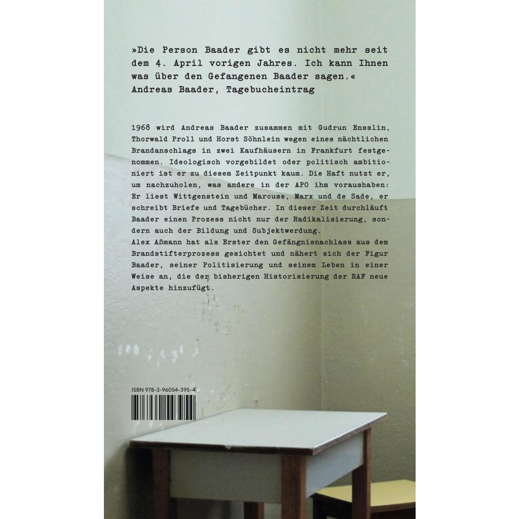 Im April 1968, zwei Jahre bevor sich die Rote Armee Fraktion gründet, wird Andreas Baader in Frankfurt festgenommen und zusammen mit Gudrun Ensslin, Thorwald Proll und Horst Söhnlein wegen eines nächtlichen Brandanschlags in zwei Kaufhäusern in Untersuchungshaft verbracht. Ideologisch vorgebildet oder politisch ambitioniert ist Baader zu diesem Zeitpunkt kaum, die folgenden 14 Monate nutzt er vor allem, um in seiner Zelle nachzuholen, was andere in der APO ihm voraushaben: Er liest Wittgenstein und Marcuse, Marx und de Sade, er schreibt Tagebuch, Lektüreexzerpte, Briefe und Drehbuchentwürfe. Seine Haftzeit kann nicht nur als Prozess einer Radikalisierung verstanden werden, an dessen Ende Baader mit einem ausgeprägten Hass auf den Staat entlassen wird, sondern auch als Prozess der Bildung und Subjektwerdung, in dessen Verlauf der Gefangene manchmal das Gefühl hat, im Gefängnis freier zu sein als 'draußen'. Alex Aßmann hat als Erster Baaders Gefängnisnachlass aus dem Brandstifterprozess gesichtet - Notizbücher im Umfang von über tausend Seiten und zahllose Briefe, vor allem adressiert an Gudrun Ensslin. Von diesem Material ausgehend nähert sich Aßmann der Figur Baader und dessen Leben bis zum Brandstifterprozess in einer Weise an, die in der bisherigen Historisierung der RAF ungewöhnlich ist, mancher Darstellung des verhätschelten Jungen und späteren notorischen Kriminellen eine andere Perspektive an die Seite stellt und die persönliche Entwicklung eines Staatsfeindes auch in die intellektuelle Geschichte der BRD einordnet.