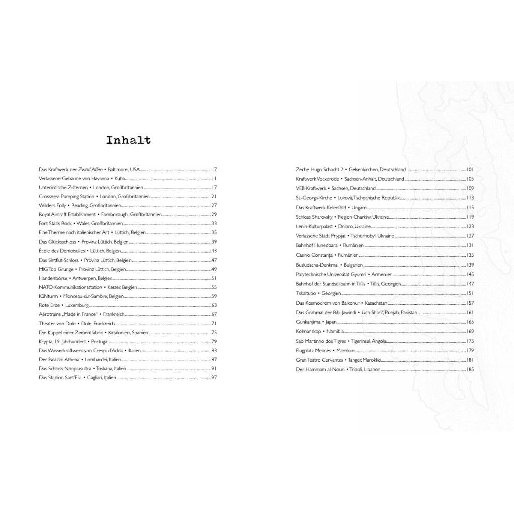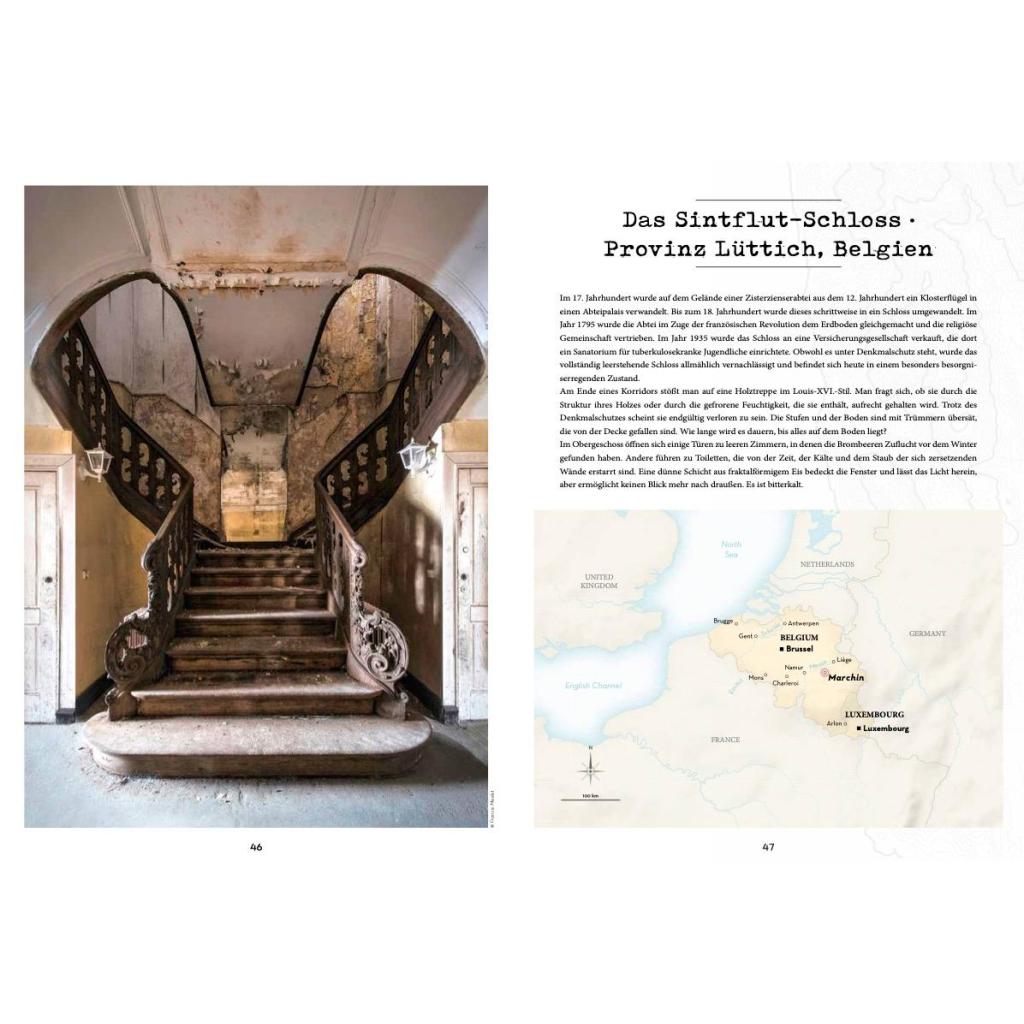 ATLAS DER LOST PLACES DIE 50 SPEKTAKULÄRSTEN URBEX-ORTE DER WELT Eine verlassene japanische Insel, auf der ein James-Bond-Film gedreht wurde, vergessene unterirdische Tanks im Herzen Londons, eine ganze Stadt, die in Namibia vom Sand verschluckt wurde, ein außergewöhnliches toskanisches Schloss, das seit Jahrzehnten verlassen ist, ein grandioses Kino, das in Tanger verfällt, spektakuläre verlassene Fabriken in den USA, in Deutschland oder auch in Ungarn... Überall auf der Welt gerät ein großer Teil unseres architektonischen Erbes allzu oft in Vergessenheit. Viele der schlafenden Schätze der Welt werden als wertlose Relikte einer längst vergangenen Epoche betrachtet, eine Sichtweise, die nur darauf wartet, geändert zu werden, wie dieser Atlas beweist. Er erinnert uns daran, wie wichtig es ist, überall auf der Welt zur Erhaltung des Kulturerbes beizutragen, auf dem der kulturelle Reichtum unserer Welt beruht.