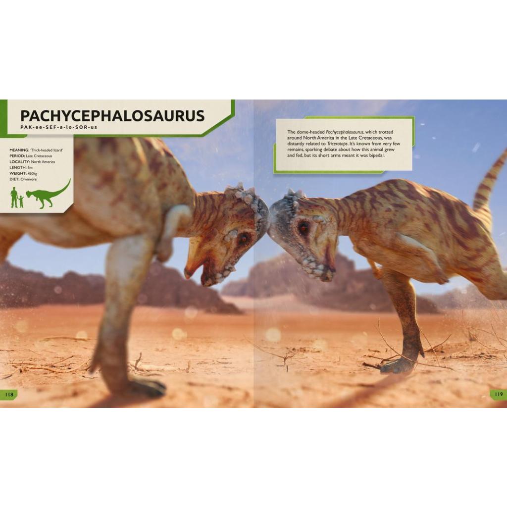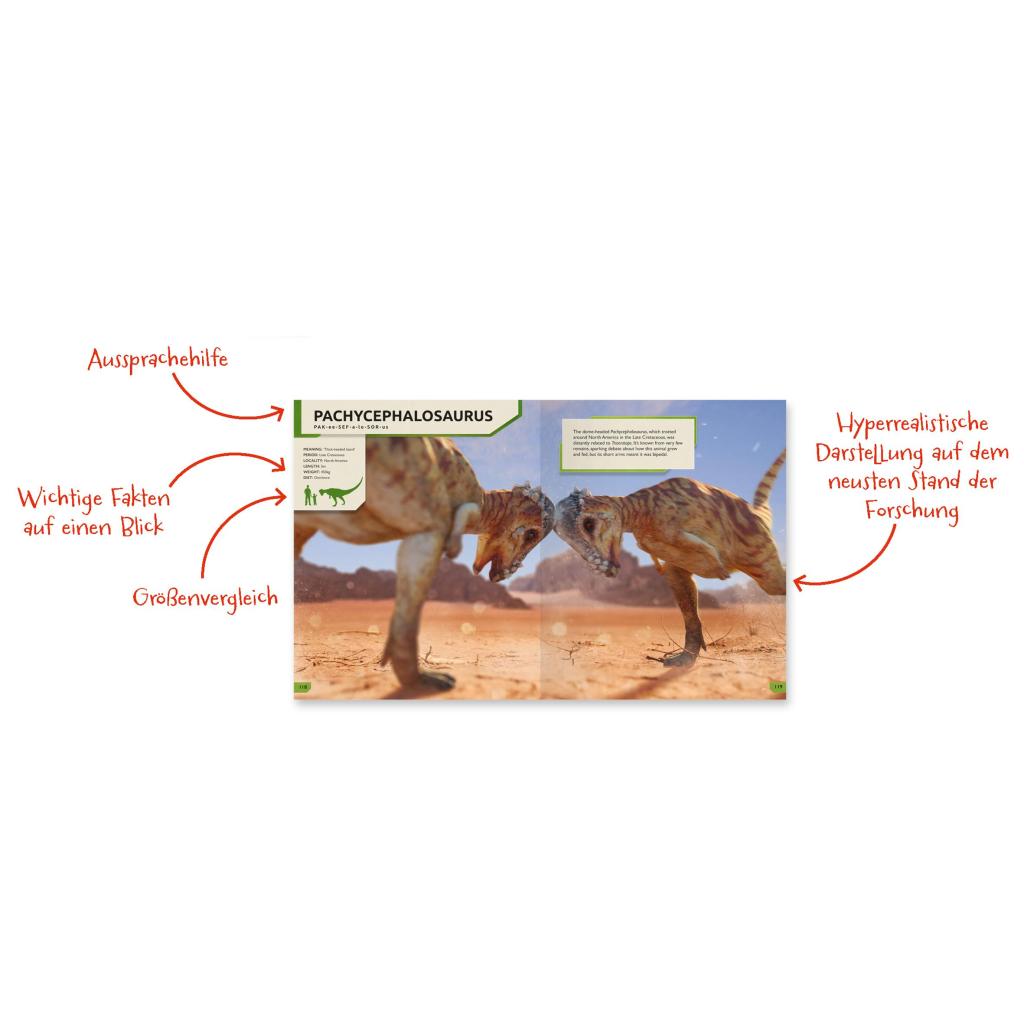Lebensecht: Dieses umfassende Dinosaurierlexikon zeigt die Urzeitechsen in fotorealistischen Darstellungen auf dem neuesten Stand der Dino-Forschung. Wie klang der Ruf eines T-Rex? Lebten Ankylosaurier in Herden? Welche Farbe hatte das Federkleid des Archaeopteryx? Dieses zeitlich geordnete Dino-Lexikon bietet 160 Seiten voll erstaunlicher Fakten und Informationen über die mächtigsten Tiere der Urgeschichte. Fotorealistische Rekonstruktionen auf dem neuesten Stand der Wissenschaft lassen zahlreiche Dinosaurierarten und ihre prähistorische Welt lebendig werden. Fossilienfotos vermitteln einen Eindruck von der Arbeit der Paläontologen.