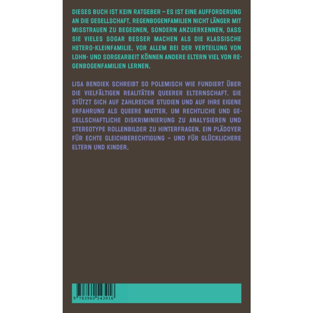 | Keyword: | Abstammungsrecht; Care-Arbeit; Diskriminierung; Elternschaft; Erziehung; Gender Care Gap; Gender Pay Gap; Geschlechterrollen; Gleichberechtigung; Homosexualität; Kleinfamilie; LGBT; LGBTQIA; Lesben; Männlichkeit; Queerness; Rechtsruck; Regenbogenfamilien; Reproduktion; Stiefkindadoption; Ungleichheit; neue Väter; queere Familie |