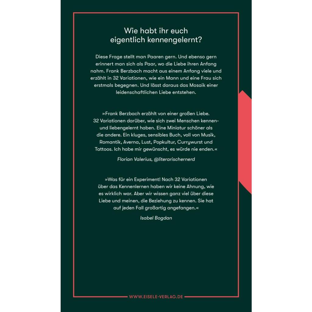 | Keyword: | 32 Begegnungen; Berlin; Beziehung; Gefühle; Geschichten; Goldberg-Variationen; Hamburg; Humor; Johann Sebastian Bach; Kennenlernen; Kleinstadt; Kreativität; Köln; Liebe; Literatur; London; Mode; Mosaik aus Liebesgeschichten; Motive; Paare; Philosophie; Popkultur; Popmusik; Realismus; Romantik; Spiritualität; Tattoos; Valentinstag; Varianten; Variation; Verlieben; Wahrheit; schlaflos |
