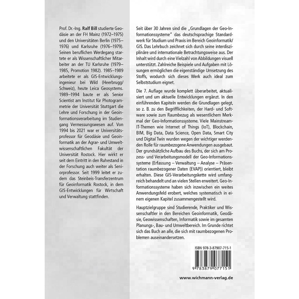 Seit über 30 Jahren sind die "Grundlagen der Geo-Informationssysteme" das deutschsprachige Standardwerk für Studium und Praxis im Bereich Geoinformatik/GIS. Das Lehrbuch zeichnet sich durch seine interdisziplinäre und internationale Betrachtungsweise aus. Der Inhalt wird durch eine Vielzahl von Abbildungen visuell unterstützt. Zahlreiche Beispiele und Aufgaben mit Lösungen ermöglichen die eigenständige Umsetzung des Stoffs, wodurch sich dieses Werk auch ideal zum Selbststudium eignet. Die 7. Auflage wurde komplett überarbeitet, aktualisiert und um aktuelle Entwicklungen ergänzt. In den einführenden Kapiteln werden die Grundlagen gelegt, so z. B. zu den Begrifflichkeiten, der Hard- und Software sowie zum Raumbezug als wesentlichem Merkmal der Geo-Informationssysteme. Viele Mainstream-IT-Themen wie Internet of Things (IoT), Blockchain, BIM, Big Data, Data Science, Open Data, Smart City und Digital Twin wurden wegen der wichtiger werdenden Rolle für raumbezogene Anwendungen ausgebaut. Der grundsätzliche Aufbau des Buchs, der sich am Prozess- und Verarbeitungsmodell der Geo-Informationssysteme (Erfassung - Verwaltung - Analyse - Präsentation raumbezogener Daten (EVAP)) orientiert, bleibt erhalten. Diese GIS-Verarbeitungskette wird umfangreich behandelt und an vielen Stellen erweitert. Geo-Informationssysteme haben sich inzwischen ein weites Anwendungsfeld erobert, welches systematisch in einem eigenen Kapitel zusammengestellt wird. Hauptzielgruppe sind Studierende, Praktiker und Wissenschaftler in den Bereichen Geoinformatik, Geodäsie, Geowissenschaften, Informatik sowie im gesamten Planungs-, Bau- und Umweltbereich. Im Grunde richtet sich das Buch an alle, die sich mit raumbezogenen Problemen auseinandersetzen.