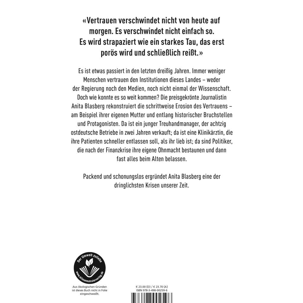 Es ist etwas passiert in den letzten dreißig Jahren. Immer weniger Menschen vertrauen den Institutionen dieses Landes - weder der Regierung noch den Medien, noch nicht einmal der Wissenschaft. Doch wie konnte es so weit kommen? Die preisgekrönte Journalistin Anita Blasberg rekonstruiert die schrittweise Erosion des Vertrauens - am Beispiel ihrer eigenen Mutter und entlang historischer Bruchstellen und Protagonisten. Da ist ein junger Treuhandmanager, der achtzig ostdeutsche Betriebe in zwei Jahren verkauft; da ist eine Klinikärztin, die ihre Patienten schneller entlassen soll, als ihr lieb ist; da sind Politiker, die nach der Finanzkrise ihre eigene Ohnmacht bestaunen und dann fast alles beim Alten belassen. Packend und schonungslos ergründet Anita Blasberg eine der dringlichsten Krisen unserer Zeit. 'Ein bemerkenswertes Buch!' Maja Göpel 'Anita Blasberg erzählt so unaufgeregt wie eindringlich, warum das Vertrauen von immer mehr Deutschen in ihren Staat so erschüttert ist. Sie zeigt, was das macht mit unserem Land - und mit den Menschen, im Osten wie im Westen.' Florian Illies 'Das ist das Thema der Stunde. Ich habe schon lange nicht mehr ein Buch gelesen, das so viel in mir ausgelöst hat. Ich hoffe, es werden viele Menschen lesen. Unsere Gesellschaft hat es nötig.' Verena Hasel 'Anita Blasberg kann so hinreißend erzählen, dass man mitten ins Geschehen geworfen wird und gleichzeitig eine messerscharfe Analyse des Erlebten serviert bekommt.' Anja Reschke, NDR 'Anita Blasberg, eine der besten Reporterinnen des Landes, hat ein ebenso wichtiges wie großartiges Buch geschrieben.' Patrick Bauer, SZ-Magazin 'Leseempfehlung! Anita Blasberg geht dem gefährlichen Vertrauensverlust gegenüber Politik, Medien und Wissenschaft auf die Spur. Ausgehend von Gesprächen mit ihrer Mutter, doch mit gesamtgesellschaftlichem Blick. Sehr überzeugend.' Gerhard Schick