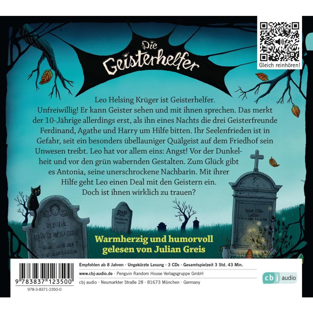 Auch Geister brauchen Hilfe - der spannende Serienauftakt rund um die Geisterhelfer Leo und Antonia Leo Helsing Krüger muss eines Nachts auf dem Friedhof mit Schrecken feststellen, dass er Geister nicht nur sehen, sondern auch mit ihnen sprechen kann. Obwohl ihm die gruseligen Gestalten versichern, dass er aufgrund seiner Fähigkeiten ein fantastischer Helfer für allerlei Geisterangelegenheiten sei, hat er vor allem eins: große Angst! Nicht nur vor der Dunkelheit, sondern auch vor den grün wabernden Gestalten. Zum Glück findet er in der unerschrockenen Antonia eine Freundin, die ihm mit Rat und Tat zur Seite steht. Mit ihrer Hilfe springt Leo über seinen Schatten und geht einen Deal mit den Geistern ein: Doch ist ihnen wirklich zu trauen? Ungekürzte Lesung mit Julian Greis 3 CDs, ca. 3h 40min