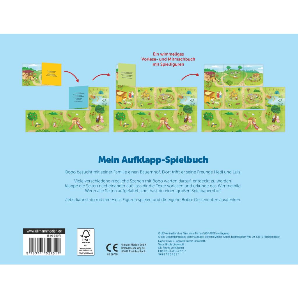 Ein wimmeliges Spielbuch mit Bobo, Mama, Papa und vielen Figuren aus der TV-Serie. Bobo besucht mit seiner Familie einen Bauernhof. Dort trifft er auch seine Freunde. Bobo, Hedi und Luis schaukeln, rutschen und füttern die Tiere. Sie haben jede Menge Spaß. Viele verschiedene niedliche Szenen mit Bobo warten darauf, entdeckt zu werden: Klappe die Seiten nacheinander auf, lass dir die Texte vorlesen und erkunde das Wimmelbild. Wenn alle Seiten aufgefaltet sind, hast du einen großen Spielbauernhof. Jetzt kannst du mit den Holz-Figuren spielen und dir eigene Bobo-Geschichten ausdenken. Ein wimmeliges Vorlese- und Mitmachbuch mit Spielfiguren. Das Buch ist perfekt zum Anschauen, Vorlesen und Mitspielen geeignet.