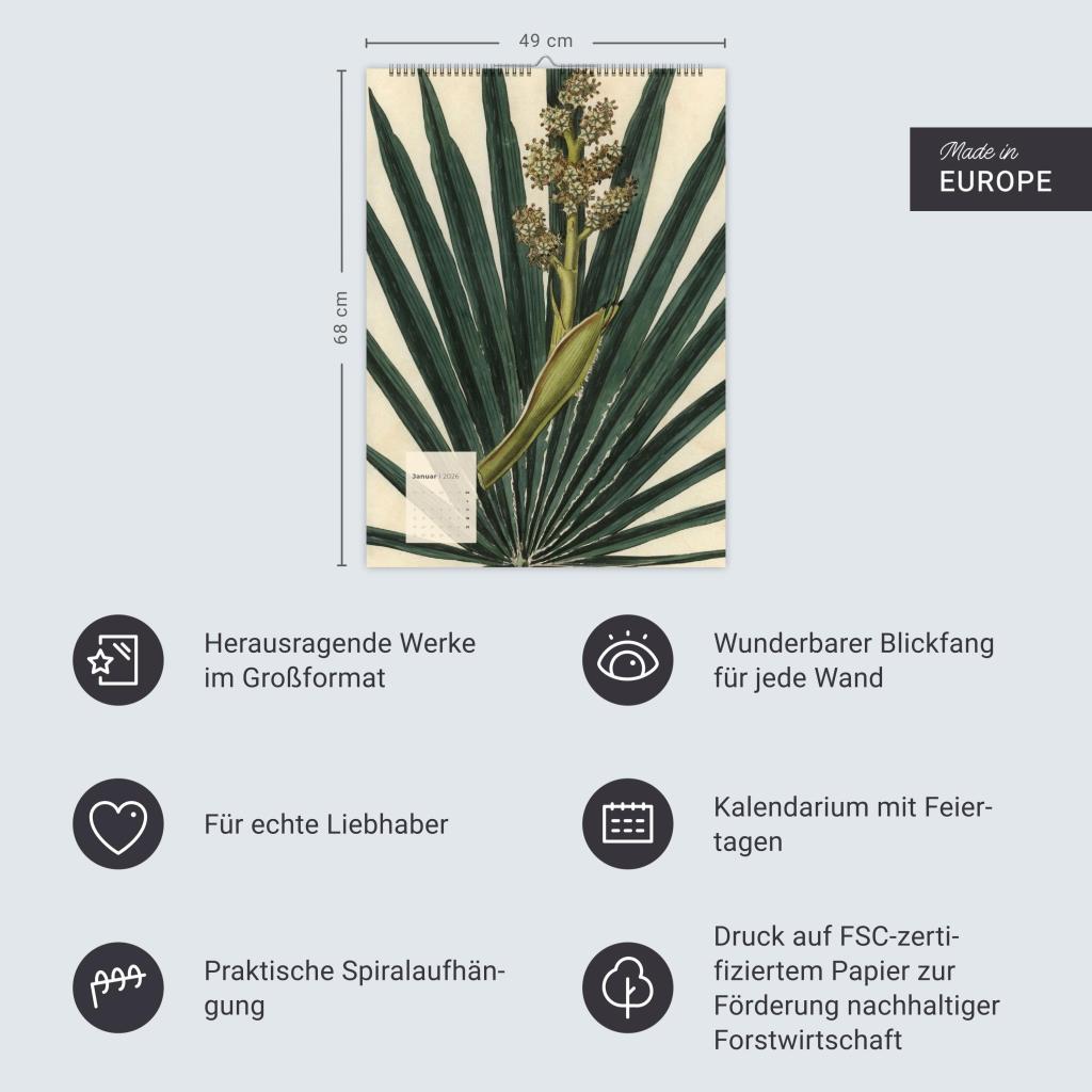 Jahres-Wandkalender 2026. Imposante Blätter-Kunst im Retro-Look. Historisch-botanische Zeichnungen, zeitgemäß inszeniert. Beeindruckender Kunstkalender im Großformat 49 x 68 cm