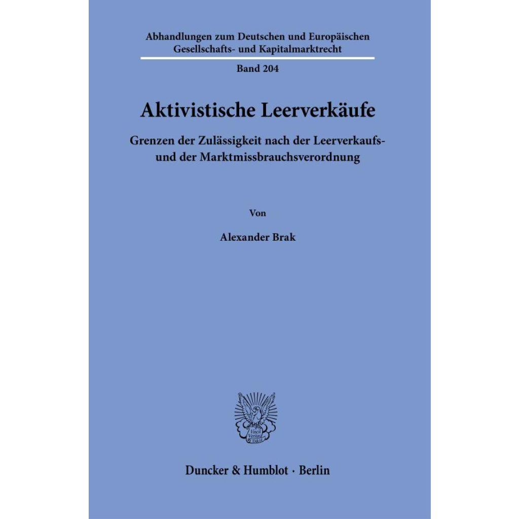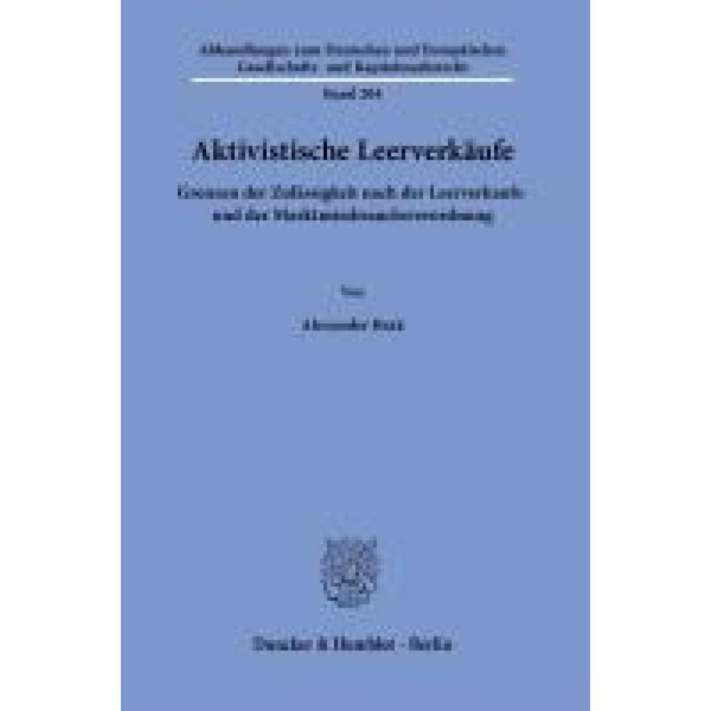 »Activist Short Selling - Limits of Admissibility after the Short Selling- and Market Abuse-Regulation«: Activist Short Selling is widely discussed in literature and public not only since the case of "Wirecard". Starting from the economic value of this business model, this study analyzes its current legal framework and reviews, how the statutory law matches with the economic evaluation. Based on this approach, this work wants to provide a distinction with the use of the legal guidelines between the positive and negative forms of this business model.