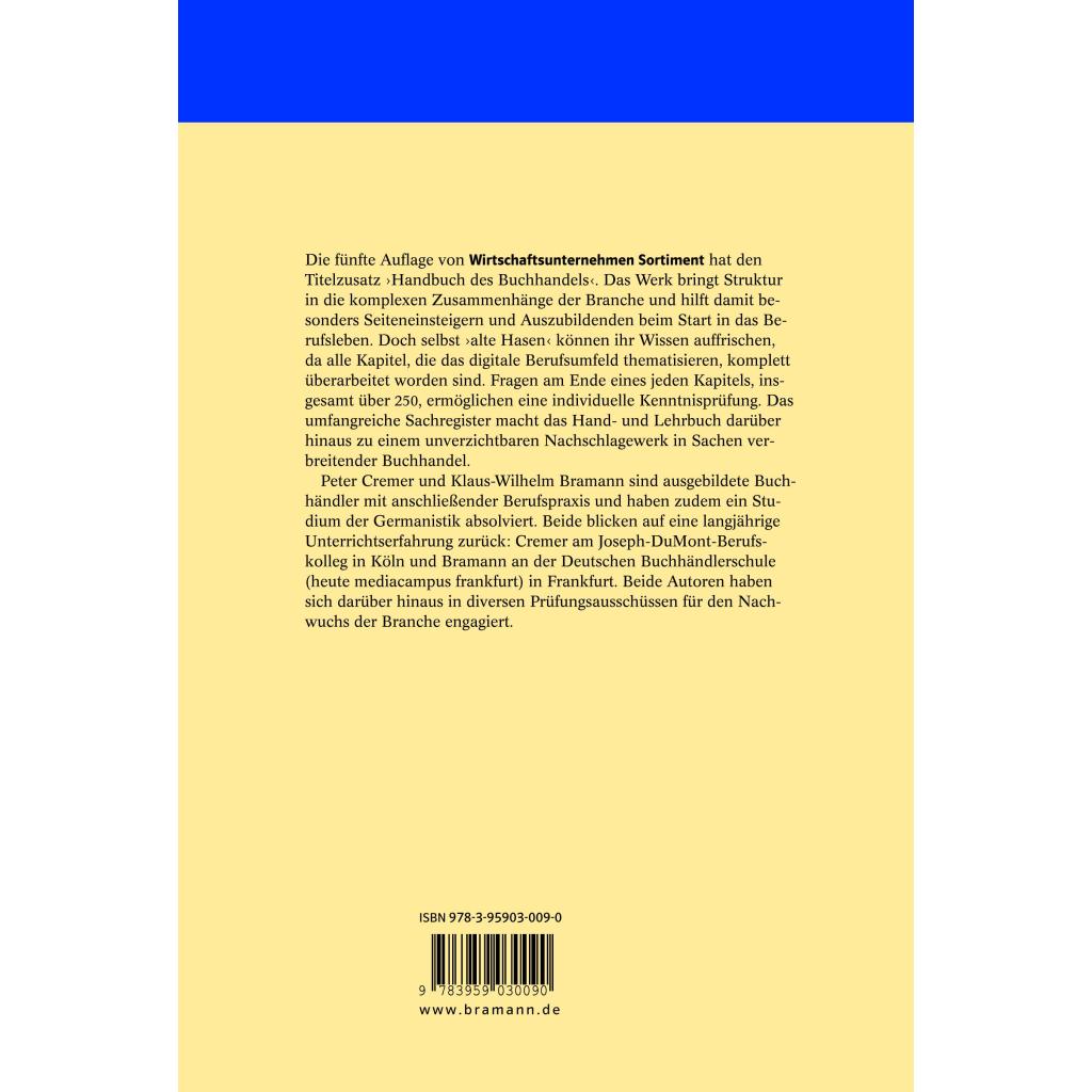 Die fünfte Auflage von Wirtschaftsunternehmen Sortiment hat den Titelzusatz ¿Handbuch des Buchhandels¿. Das Werk bringt Struktur in die komplexen Zusammenhänge der Branche und hilft damit besonders Seiteneinsteigern und Auszubildenden beim Start in das Berufsleben. Doch selbst ¿alte Hasen¿ können ihr Wissen auffrischen, da alle Kapitel, die das digitale Berufsumfeld thematisieren, komplett überarbeitet worden sind. Fragen am Ende eines jeden Kapitels, insgesamt über 250, ermöglichen eine individuelle Kenntnisprüfung. Das umfangreiche Sachregister macht das Hand- und Lehrbuch darüber hinaus zu einem unverzichtbaren Nachschlagewerk in Sachen verbreitender Buchhandel. Peter Cremer und Klaus-Wilhelm Bramann sind ausgebildete Buchhändler mit anschließender Berufspraxis und haben zudem ein Studium der Germanistik absolviert. Beide blicken auf eine langjährige Unterrichtserfahrung zurück: Cremer am Joseph-DuMont-Berufskolleg in Köln und Bramann an der Deutschen Buchhändlerschule (heute mediacampus frankfurt) in Frankfurt. Beide Autoren haben sich darüber hinaus in diversen Prüfungsausschüssen für den Nachwuchs der Branche engagiert.