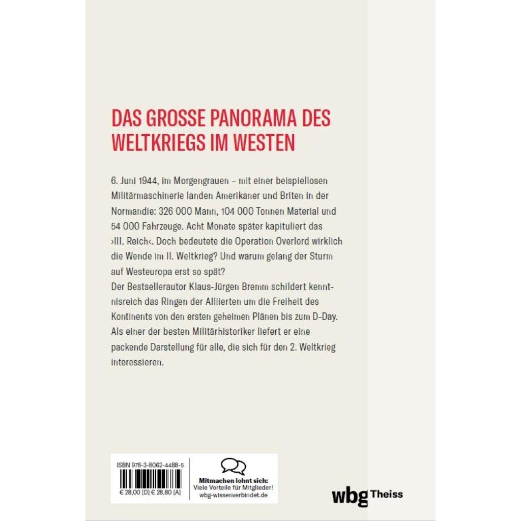 Der Zweite Weltkrieg im Westen und die Befreiung Europas durch die Alliierten Im Morgengrauen des 6. Juni 1944 landeten die Alliierten am Omaha-Beach in der Normandie: Die Operation Overlord begann. Acht Monate später kapitulierte Deutschland. Brachte die Invasion die entscheidende Wende im Krieg? Was folgte auf den D-Day, eine der wichtigsten Schlachten des Zweiten Weltkriegs? Wie vollzog sich der Siegeszug der Alliierten bis zum Rhein, während die Sowjetunion die Heeresgruppe ¿Mitte¿ zerschlug? Der Militärhistoriker und Bestseller-Autor Klaus-Jürgen Bremm schildert in seinem großen Panorama den Weltkrieg im Westen. In seiner dichten historischen Darstellung analysiert er die ersten geheimen Pläne der Landungsoperation, die Ereignisse am längsten Tag und den anschließenden Vormarsch der Alliierten auf Paris. - Ein umfassendes Panorama der Endphase des Zweiten Weltkriegs im Westen - Kenntnisreiche Analyse von einem der besten Militärhistoriker - Vom Vormarsch der Deutschen und dem Bau des Atlantikwalls an der Westfront bis zur Befreiung Frankreichs durch die Alliierten - Packend erzähltes Sachbuch für alle, die sich für den 2. Weltkrieg interessieren Der lange Kampf um die Freiheit: die Zurückeroberung des Westens durch die Alliierten Wie groß war die Wahrscheinlichkeit, dass die Invasion an den Stränden der Normandie scheitern könnte? Welche Überlegungen gab es bei den Alliierten, etwa von General Montgomery? Womit rechnete die deutsche Wehrmacht? Das sind nur einige der Aspekte in der Kriegsgeschichte über den Zweiten Weltkrieg im Westen von Klaus-Jürgen Bremm. Sein Sachbuch ermöglicht wertvolle Einblicke in das Geschehen am bedeutendsten Kriegsschauplatz im 2. Weltkrieg im Westen Europas.