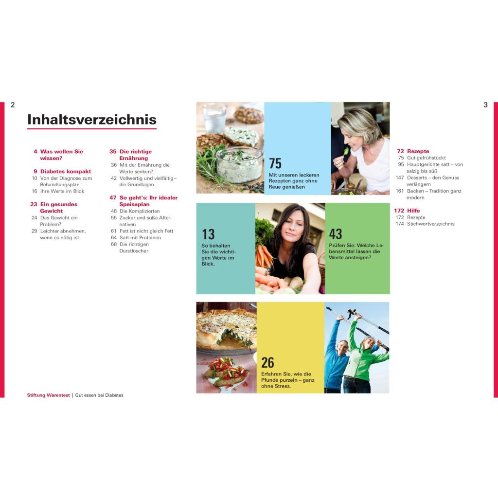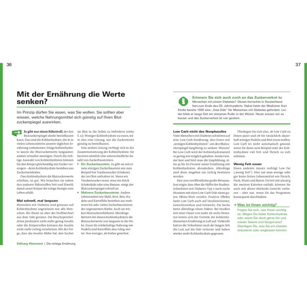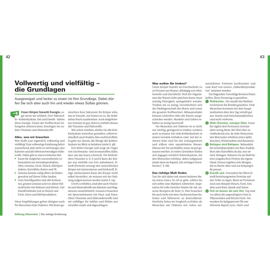 Lecker essen, das Leben genießen Der gesunde Genuss-Ratgeber bei einer Diabetes 2 Erkrankung Schlemmen trotz Diabetes? Geht das überhaupt? Diabetes ist eine Erkrankung, die für einen erhöhten Blutzuckerspiegel sorgt. Diabetes Typ 2 wird daher häufig mit Verzicht auf die persönlichen Lieblingsgerichte und die eigens beliebten Getränke verbunden. Das stimmt so jedoch schon lange nicht mehr. Mithilfe dieses Ratgebers können Sie nicht nur spannende Rezepte entdecken, sondern auch viele verlässliche und wertvolle Informationen zu dieser Erkrankung gewinnen. Bei einer solchen Krankheit wie Diabetes geht es darum, ein ausgewogenes Verhältnis von Gemüse, Kohlenhydraten, Fett und Eiweiß zu finden, ohne, dass Sie dabei vollkommen auf Zucker und Kohlenhydrate verzichten müssen. Außerdem ist es bei einer solchen Erkrankung besonders wichtig dem Körper ausreichende und abwechslungsreiche Nährstoffe anzubieten, um den Blutzuckerspiegel wieder zu senken. Dieser Ratgeber von Stiftung Warentest bietet Ihnen über 80 außergewöhnlich leckere Rezeptideen und zeigt Ihnen, wie Sie Ihre Blutzuckerwerte dank eines bewusst ausgearbeiteten Speiseplans im Griff behalten. Verschiedenste unwiderstehliche Kreationen von einem fruchtig-süßen Frühstück bis hin zu herzhaften Hauptgerichten erwarten Sie. - über 80 unwiderstehliche Rezepte - anschauliche Bilder - wertvolle Informationen rund um Diabetes 2