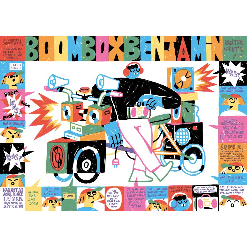 In "Boah, was für ein Fahrrad!?" möchte Loki sich selbst ein Fahrrad bauen. Aber wie das genau aussehen soll, weiß Loki auch noch nicht so genau und trifft sich daher kurzerhand zur Inspiration mit den faszinierendsten Fahrrad-Besitzer*innen in der Nachbarschaft - samt ihrer einzigartigen Gefährte natürlich.¿ Und dabei gibt es viel zu bestaunen: ein Fahrrad gebaut ausschließlich aus Sportausrüstung, einen fahrenden Garten, ein Kunstatelier inklusive Staffelei und Farbtöpfen oder sogar ein ganzer Flohmarkt auf Rädern. Von all diesen Ideen beflügelt fällt es Loki leicht, das eigene Rad in die Tat umzusetzen, um im Anschluss dann mit allen eine gemeinsame Radtour zu unternehmen.¿ Das Buch kombiniert Bilderbuch und Kinder-Comic zu einem lebhaften Leseerlebnis. Die Begegnungen sind in einem spielerischen Layout dargestellt, bei dem die fantasievollen Fahrräder und ihre inspirierenden und unterstützenden Besitzer*innen im Mittelpunkt stehen. "Boah, was für ein Fahrrad!?" ist ein farbenfrohes Abenteuer, das Kinder zum Entdecken und Ausprobieren einlädt und die Freude an Gemeinschaft, am Anderssein sowie den Reichtum individueller Ausdrucksformen zelebriert. - Mit ausklappbaren, bedrucktem Vorsatzpapier - Extra: herausnehmbarer Sticker