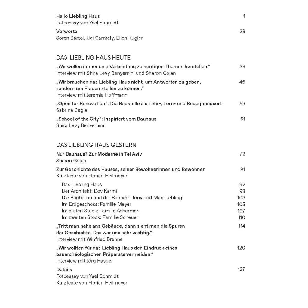 Das Liebling Haus in Tel Aviv wurde 1936 nach Entwürfen des Architekten Dov Karmi für das aus Europa geflohene Ehepaar Tony und Max Liebling gebaut. Mit seinen hellen Putzfassaden, tiefen Loggien, klaren Proportionen und einem nach dem Stadtklima ausgerichteten Grundriss ist es ein Paradebeispiel für den lokal angepassten Internationalen Stil, wie er für die Weiße Stadt Tel Aviv typisch ist. Von 2015 bis 2019 wurde es von israelischen und deutschen Planer*innen, Sanierungs-Expert*innen und Handwerker*innen aufwendig restauriert und als lebendiges Ausstellungs- und Nachbarschaftszentrum wiedereröffnet. Das Liebling Haus wird getragen und finanziert von der deutschen Bundesregierung, der Stadt Tel Aviv und der Tel Aviv Jaffa-Stiftung. Das in drei Sprachausgaben erscheinende Buch erzählt die wechselvolle Geschichte des Hauses und versammelt ausführliche historische Materialien zu dessen Architektur und seinen Bewohner*innen. Aktuelle Interviews, ein atmosphärischer Rundgang der israelischen Fotografin Yael Schmidt sowie weitere Dokumente zeigen die neue Nutzung des Liebling Haus seit der Wiedereröffnung.