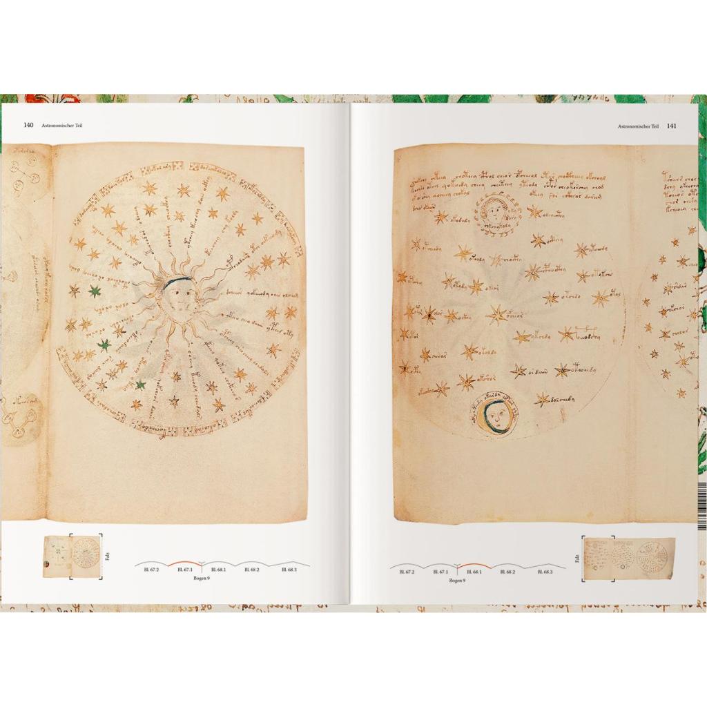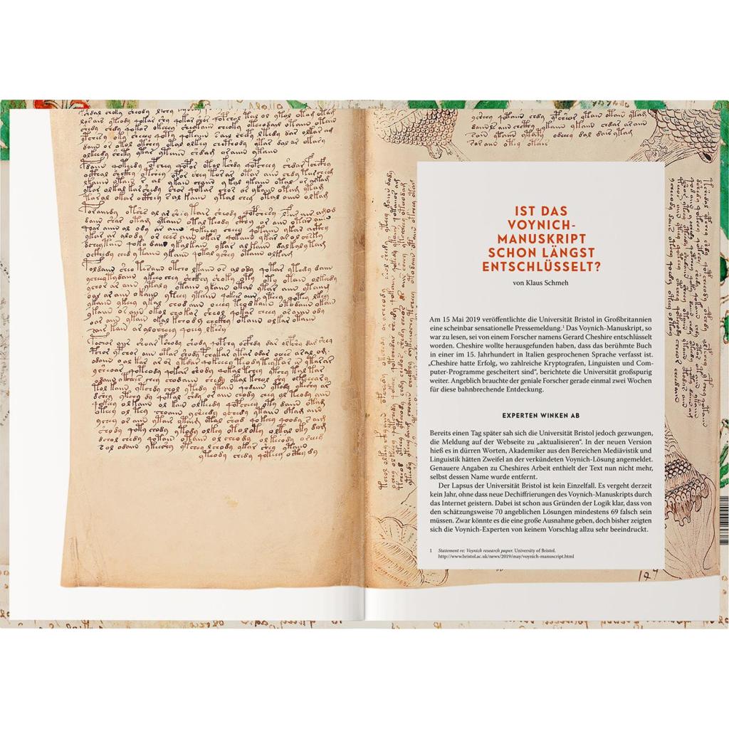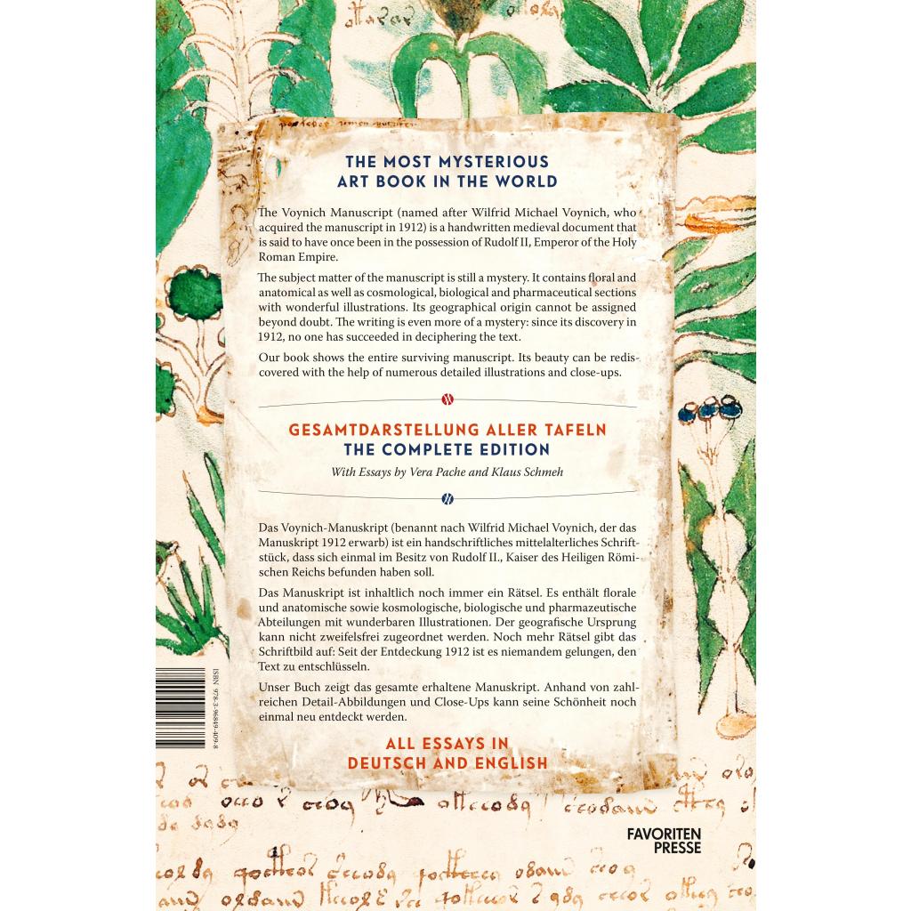 - Gesamtdarstellung aller Tafeln der wunderbar illuminierten mittelalterlichen Handschrift - das geheimnisvollste Kunstbuch der Geschichte ist bis heute nicht entschlüsselt - ein erhellender Essay führt ein in Geschichte und Interpretation Das Voynich-Manuskript (benannt nach Wilfrid Michael Voynich, der das Manuskript 1912 erwarb), ist ein handschriftliches mittelalterliches Schriftstück, dass sich einmal im Besitz von Rudolf II., Kaiser des Heiligen Römischen Reichs befunden haben soll. Das Manuskript ist inhaltlich noch immer ein Rätsel. Es enthält florale und anatomische sowie kosmologische, biologische und pharmazeutische Abteilungen mit wunderbaren Illustrationen, die geografisch nicht zweifelsfrei zugeordnet werden können; das Schriftbild gibt noch mehr Rätsel auf: Seit der Entdeckung 1912 ist es niemandem gelungen, den Text zu entschlüsseln. In regelmäßigen Abständen vermeldet jemand die Entschlüsselung, die sich aber stets als wissenschaftlich nicht haltbar erweist. Einige gefalzte Bögen-Lücken in der Paginierung zeigen, dass Seiten entnommen wurden. Unser Buch zeigt das gesamte erhaltene Manuskript mit allen sorgfältig gefertigten Zeichnungen und dem nicht zu entschlüsselnden Text. Anhand von zahlreichen Detail-Abbildungen und Close-Ups kann seine Schönheit noch einmal neu entdeckt werden. Ein Essay von Vera Pache führt in das Werk ein, durch den Einsatz grafischer Elemente wird der Leser durch das Buch geführt. Klaus Schmeh erläutert in seinem Essay die wichtigsten Entschlüsselungsversuche der vergangenen 100 Jahre. Das Original befindet sich unter der Katalognummer MS 408 im Bestand der Beinecke Rare Book and Manuscript Library der Yale University.