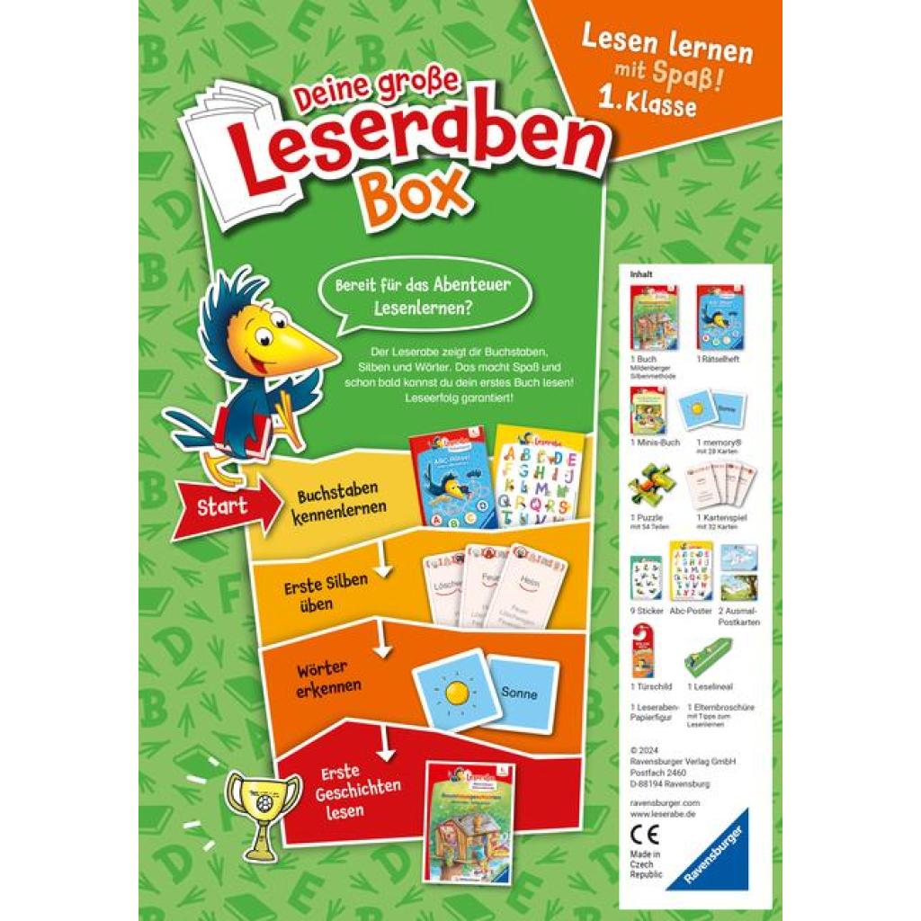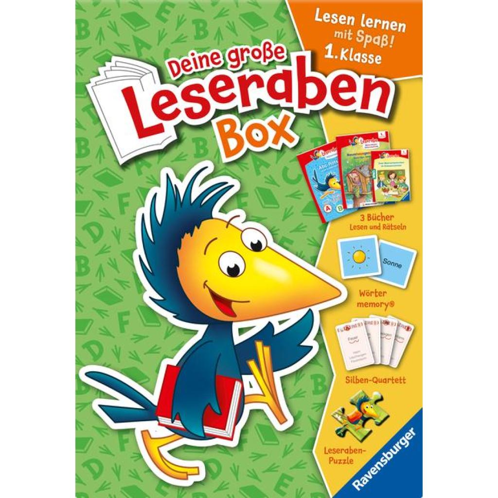 Lesen lernen wie im Flug! Endlich Schulkind! Bereit für das Abenteuer Lesenlernen? Der Leserabe zeigt Erstklässlern Buchstaben, Silben und Wörter. Er bereitet sie Schritt für Schritt darauf vor, ihr erstes Buch zu lesen. Die hochwertige Box enthält tolle Geschichten und lustige Spiele. Sie begleitet die Kinder durch die gesamte 1. Klasse. So wird Lesenlernen zum Kinderspiel! Inhalt: 3 Bücher, 1 Kartenspiel, 1 memory®, 1 Puzzle, 9 Sticker, 2 Ausmal-Postkarten, 1 Türschild, 1 Leselineal, 1 Papierfigur, 1 Elternbroschüre