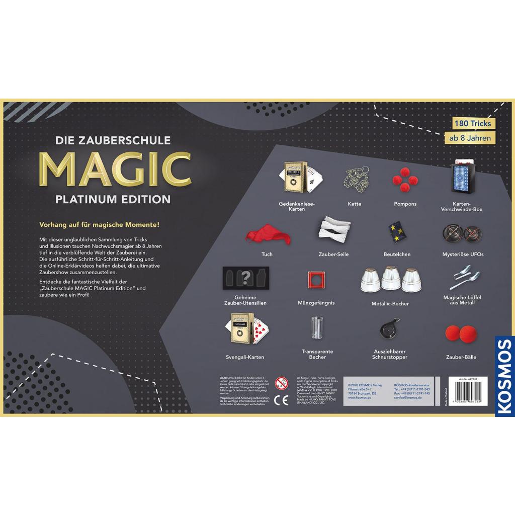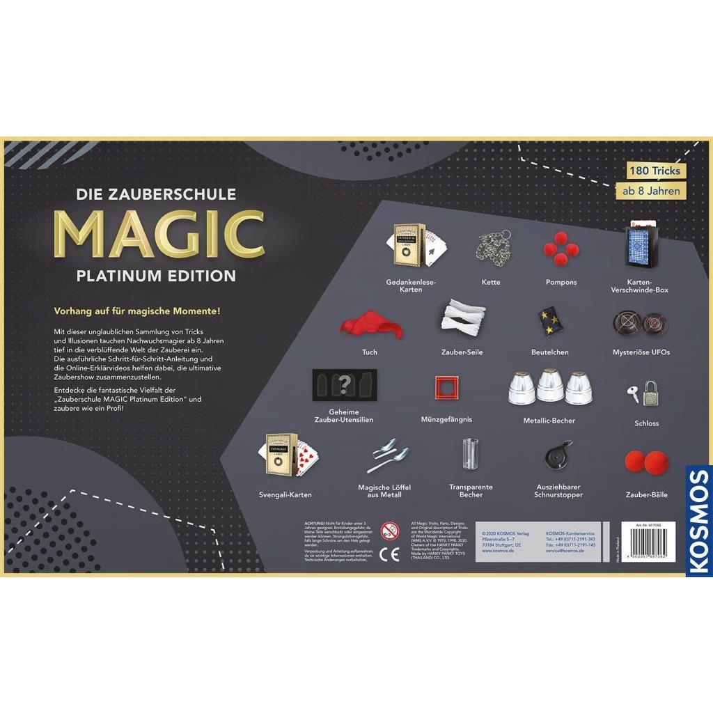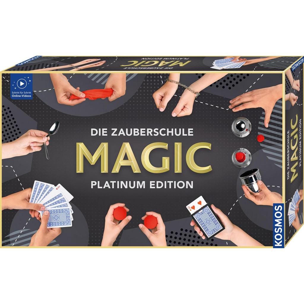 Vorhang auf für große Zauberer! Mit dem Zauberkasten "Die Zauberschule MAGIC Platinum Edition" die zauberhafte Welt der Magie eintauchen! Angehende Zauberkünstler erlernen geniale Illusionen und Tricks mit magischem Equipment. Die ausführliche Anleitung führt Kinder ab 8 Jahren durch unzählige Übungen mit Zauberdaumen, Zauberlöffel, magischen Kartendecks, Zauberbechern, Seilen, Bällen, UFOS und Co. Dabei lernen jungen Zauberer Genauigkeit, trainieren ihr schauspielerisches Talent und schulen die Konzentration. Lust auf noch mehr Magie? Online-Tutorials auf der KOSMOS-Webseite zeigen ganz besonders anspruchsvolle Übungen. Diese Schule macht riesig Spaß und sorgt für magische Momente im Kinderzimmer. Abrakadabra!