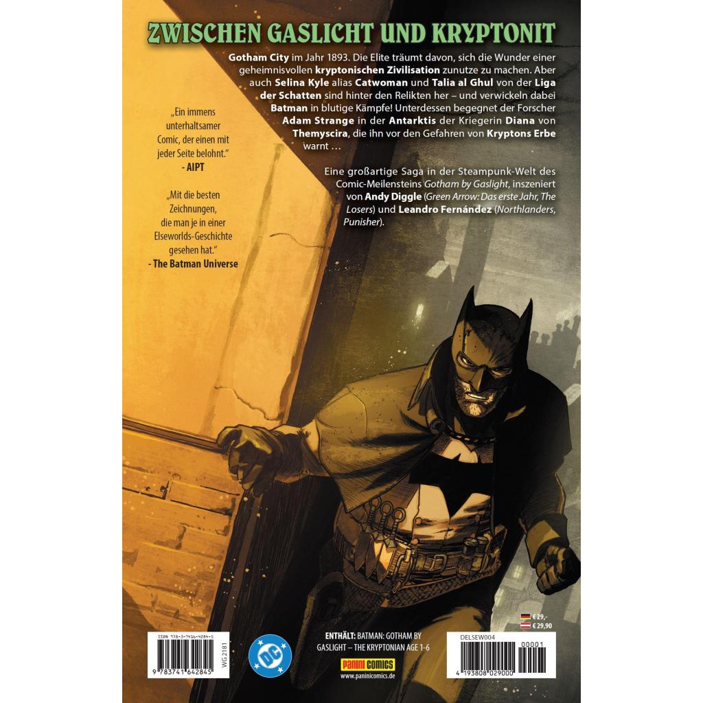 ZWISCHEN GASLICHT UND KRYPTONIT Gotham City im Jahr 1893. Die Elite träumt davon, sich die Wunder einer geheimnisvollen kryptonischen Zivilisation zunutze zu machen. Aber auch Selina Kyle alias Catwoman und Talia al Ghul von der Liga der Schatten sind hinter den Relikten her - und verwickeln dabei Batman in blutige Kämpfe! Unterdessen begegnet der Forscher Adam Strange in der Antarktis der Kriegerin Diana von Themyscira, die ihn vor den Gefahren von Kryptons Erbe warnt ... Eine großartige Saga in der Steampunk-Welt des Comic-Meilensteins Gotham by Gaslight, inszeniert von Andy Diggle (Green Arrow: Das erste Jahr, The Losers) und Leandro Fernández (Northlanders, Punisher). ENTHÄLT: BATMAN: GOTHAM BY GASLIGHT - THE KRYPTONIAN AGE 1-6