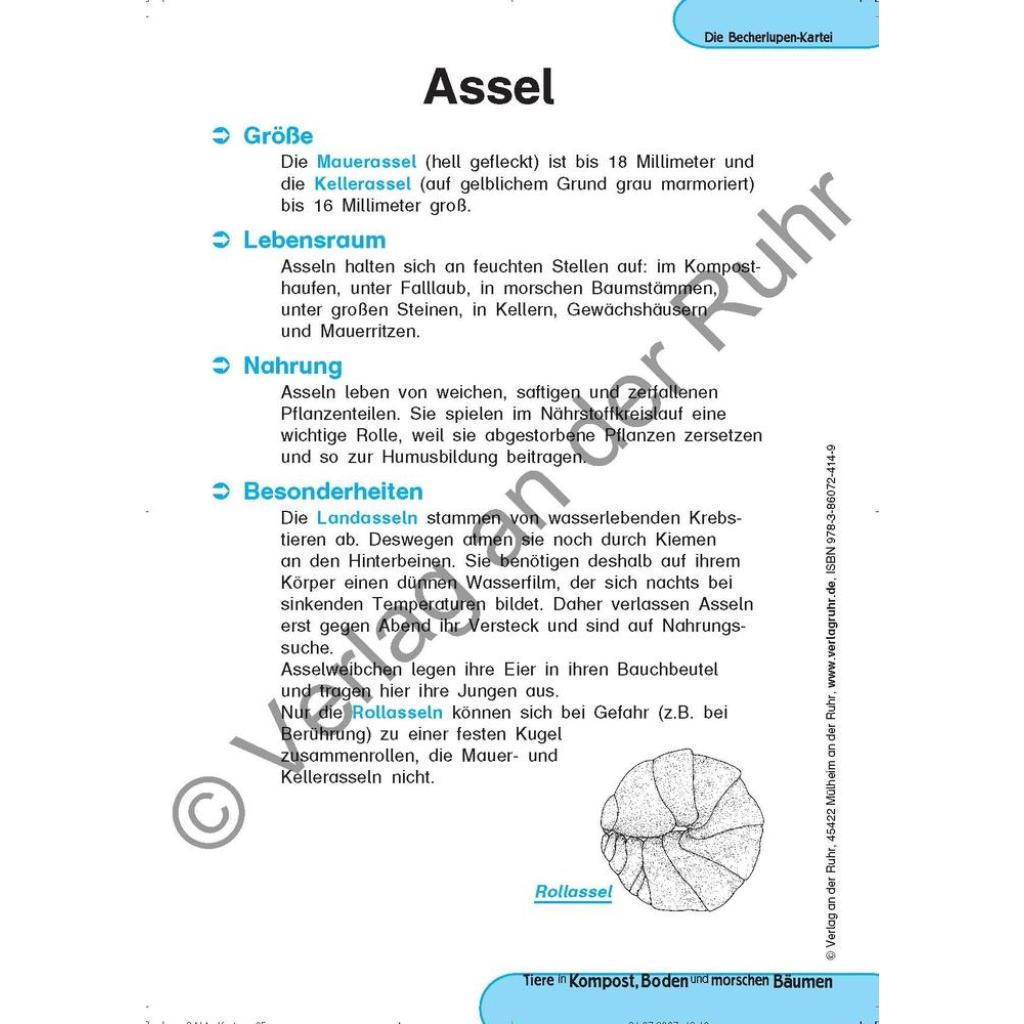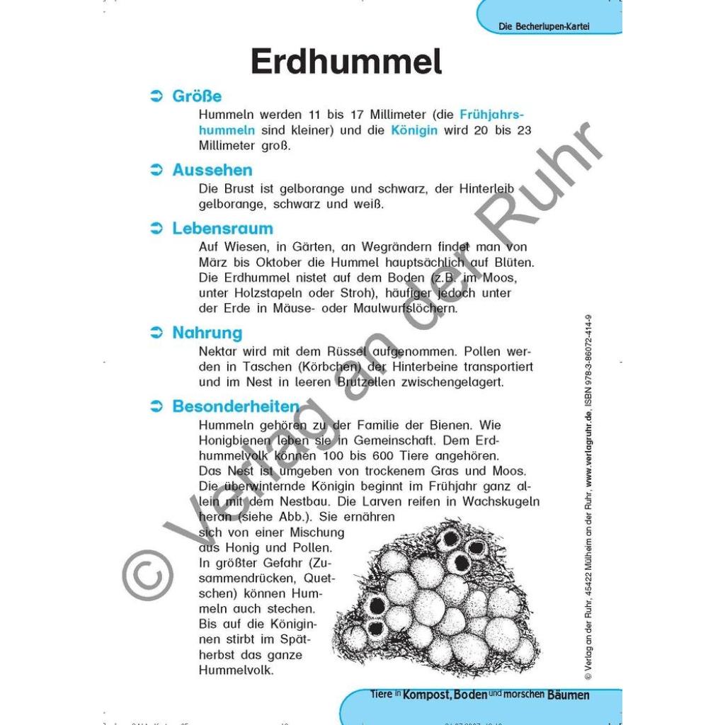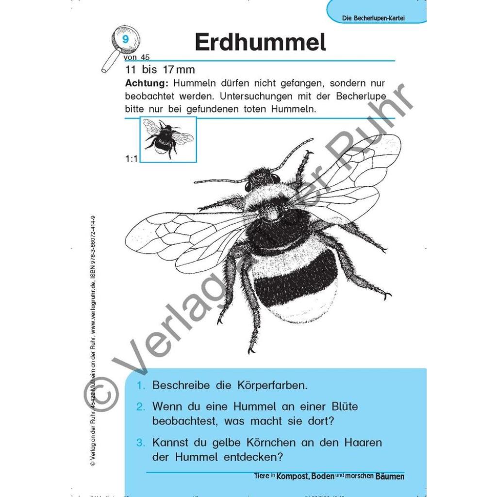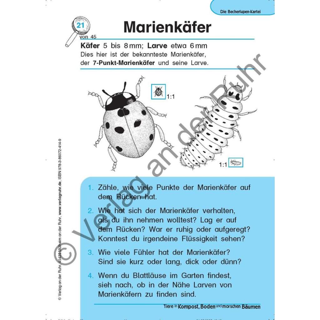 Fremde Welten direkt vor der Haustür: Unter Steinen, im Kompost oder in morschen Bäumen leben Wesen, deren Formen genauso abenteuerlich sind wie ihre Namen: Saftkugler, Steinkriecher, Springschwanz. Es lohnt sich, sie genauer unter die Lupe zu nehmen, auch wenn sie schon bekannter sind wie der Regenwurm, die Fliege oder der Ohrwurm. Denn je besser Kinder ihre Umwelt kennen, um so mehr werden sie sie schätzen und schützen wollen. In der Becherlupe wird jedes Kleintier zur abenteuerlichen Entdeckung. Erst einmal helfen die präzisen Zeichnungen auf den Karten beim Bestimmen der Tiere. Damit aber auch bei den großen Kleintieren nichts übersehen wird, finden die Kinder auf den Karteikarten viele Infos und viele Anregungen für Beobachtungen: Wo findet man die Borstenpaare des Regenwurms? Wie pflanzen sich Regenwürmer fort? Wie atmet die Landassel? Was frisst ein Steinkriecher? Alle Texte sind kindgerecht und bewusst einfach gehalten. Die A5-Karten sind dreck- und feuchtigkeitsabweisend, sodass Ihrer Expedition zu den fremden Welten vor der Haustür nichts mehr im Wege steht. Einsetzbar in Schule, privat oder in der Naturschutzarbeit.