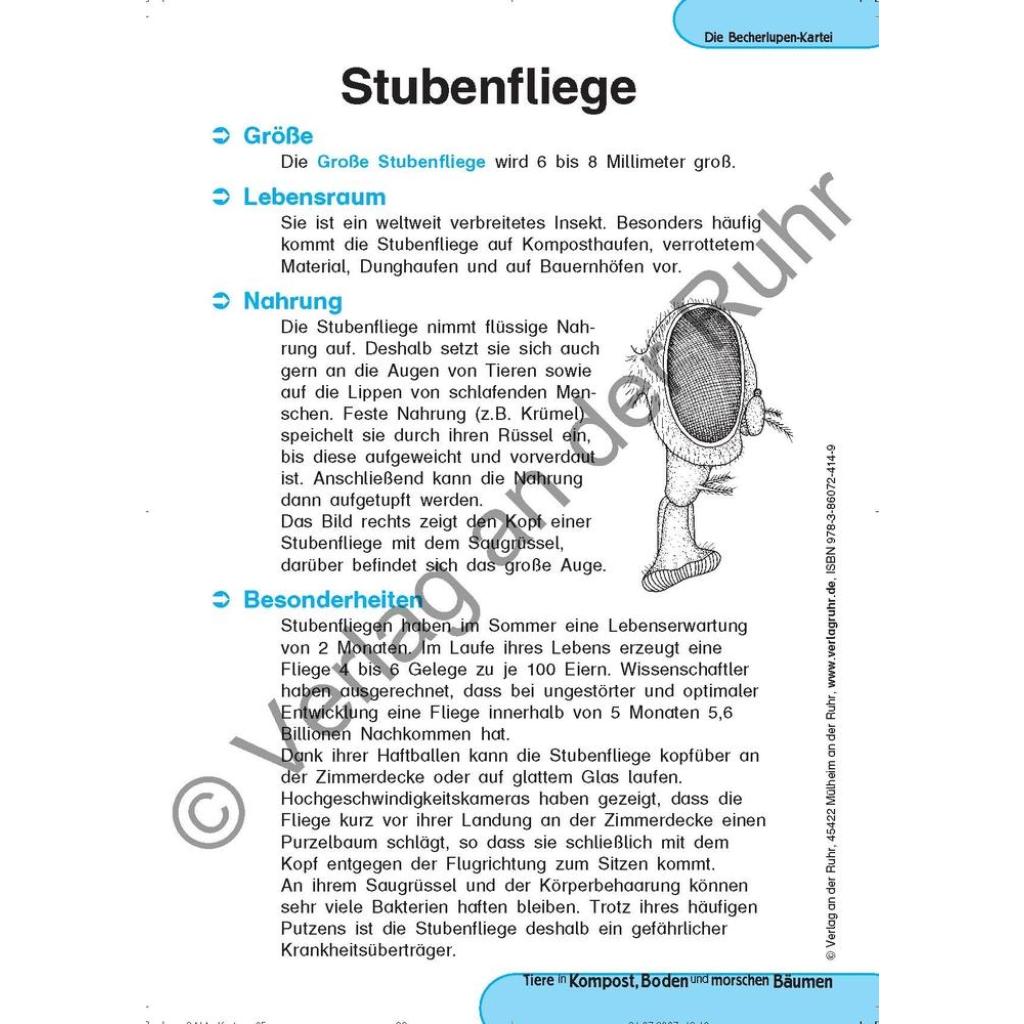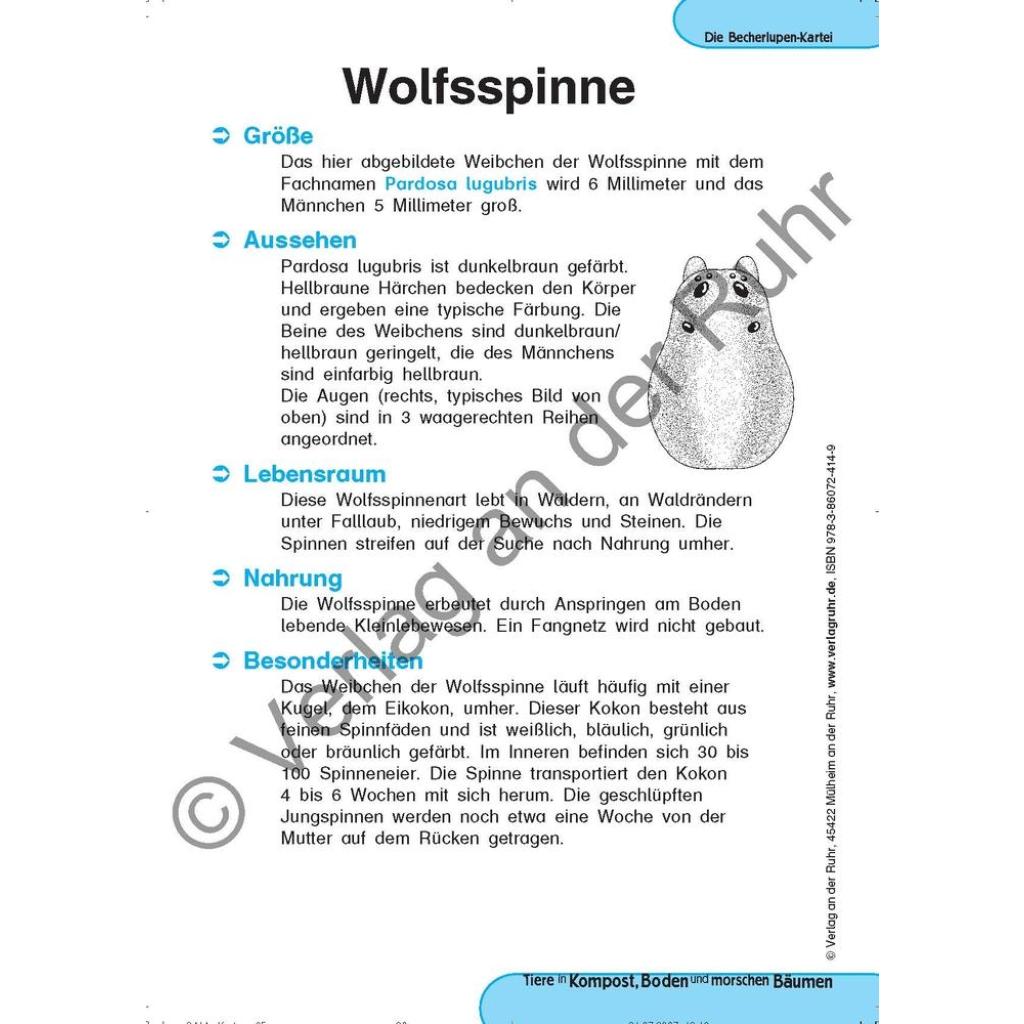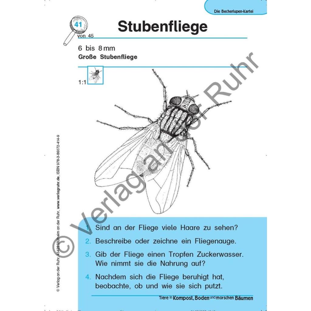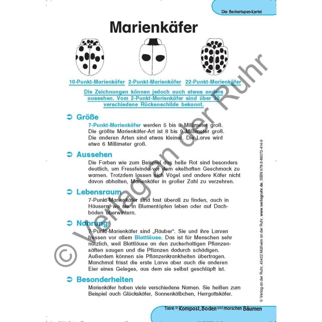 Fremde Welten direkt vor der Haustür: Unter Steinen, im Kompost oder in morschen Bäumen leben Wesen, deren Formen genauso abenteuerlich sind wie ihre Namen: Saftkugler, Steinkriecher, Springschwanz. Es lohnt sich, sie genauer unter die Lupe zu nehmen, auch wenn sie schon bekannter sind wie der Regenwurm, die Fliege oder der Ohrwurm. Denn je besser Kinder ihre Umwelt kennen, um so mehr werden sie sie schätzen und schützen wollen. In der Becherlupe wird jedes Kleintier zur abenteuerlichen Entdeckung. Erst einmal helfen die präzisen Zeichnungen auf den Karten beim Bestimmen der Tiere. Damit aber auch bei den großen Kleintieren nichts übersehen wird, finden die Kinder auf den Karteikarten viele Infos und viele Anregungen für Beobachtungen: Wo findet man die Borstenpaare des Regenwurms? Wie pflanzen sich Regenwürmer fort? Wie atmet die Landassel? Was frisst ein Steinkriecher? Alle Texte sind kindgerecht und bewusst einfach gehalten. Die A5-Karten sind dreck- und feuchtigkeitsabweisend, sodass Ihrer Expedition zu den fremden Welten vor der Haustür nichts mehr im Wege steht. Einsetzbar in Schule, privat oder in der Naturschutzarbeit.