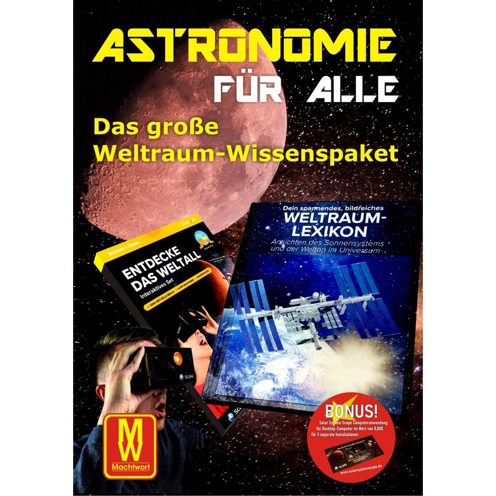 Hauptbestandteil ist das Buch "Dein spannendes, bildreiches Weltraumlexikon". Dieses Nachschlagewerk bietet dem Leser einen umfangreichen Einblick in die Geheimnisse des Weltalls, des Sonnensystems und der Raumfahrt. Zu dem Buch gehört ein Zugangscode zu dem Astronomie-Programm "Solar System Scope", das den Käufer berechtigt, die Vollversion auf bis zu fünf Geräten gleichzeitig zu installieren. Reisen Sie virtuell durch den Weltraum, beobachten Sie den Sternhimmels auch am Tag oder bei schlechtem Wetter. Als besonderes Extra ist eine VR-Brille enthalten, mit der auf der Basis des Programms "Solar System Scope" eine dreidimensionale Reise durch das Weltall simuliert werden kann. Außerdem ist der Bastelbogen für eine drehbare Sternkarte beigelegt.