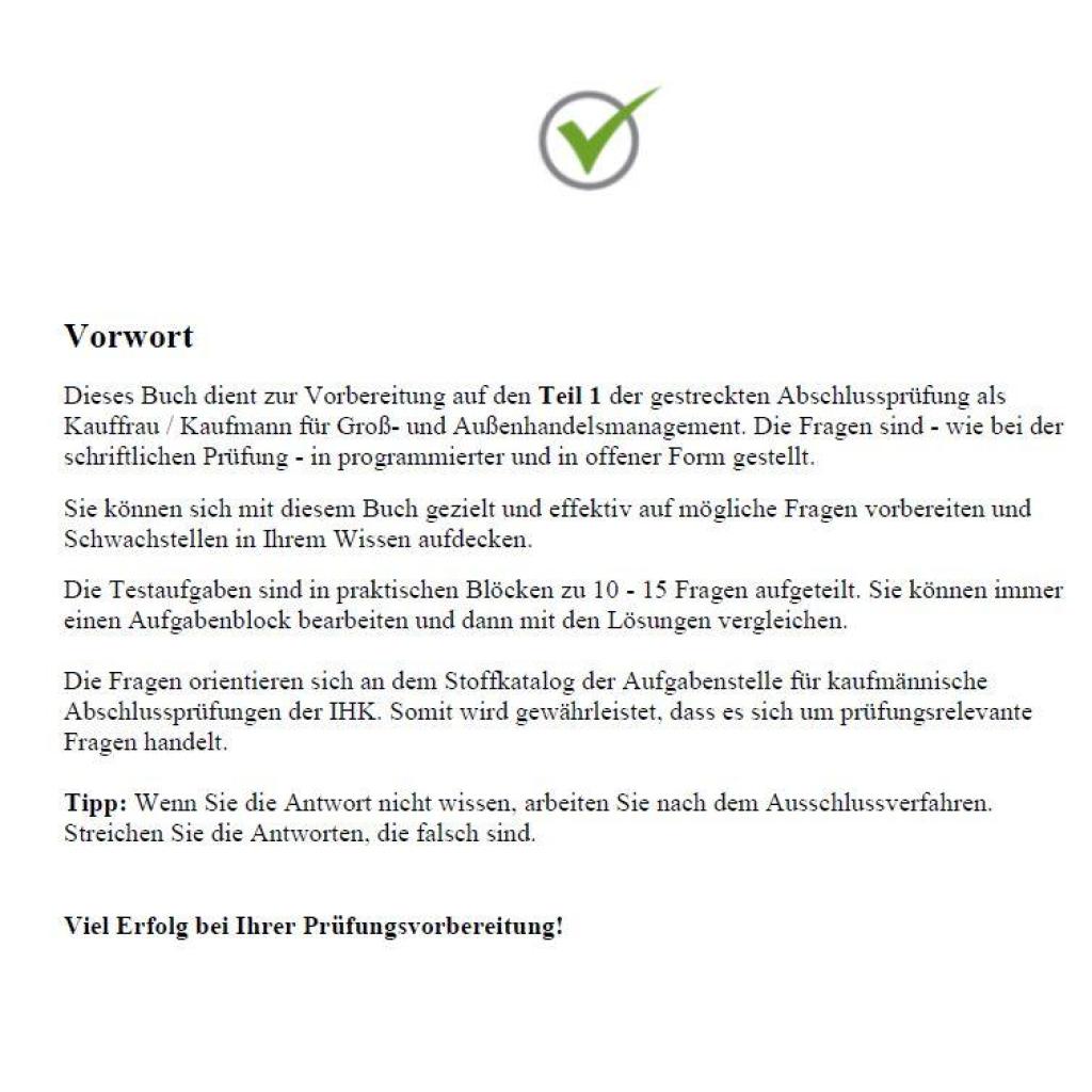 Dieses Buch mit praktischer Ringbindung dient zur Vorbereitung auf die IHK Abschlussprüfung als Kauffrau/-mann für Groß- und Außenhandelsmanagement - Teil 1 . Die Fragen sind - wie bei der schriftlichen Prüfung - in programmierter und in offener Form gestellt. Sie können sich mit diesem Buch gezielt und effektiv auf mögliche Fragen vorbereiten und Schwachstellen in Ihrem Wissen aufdecken. Die Übungsaufgaben sind in praktischen Blöcken zu 10 - 15 Fragen aufgeteilt. Sie können immer einen Aufgabenblock bearbeiten und dann mit den Lösungen vergleichen.