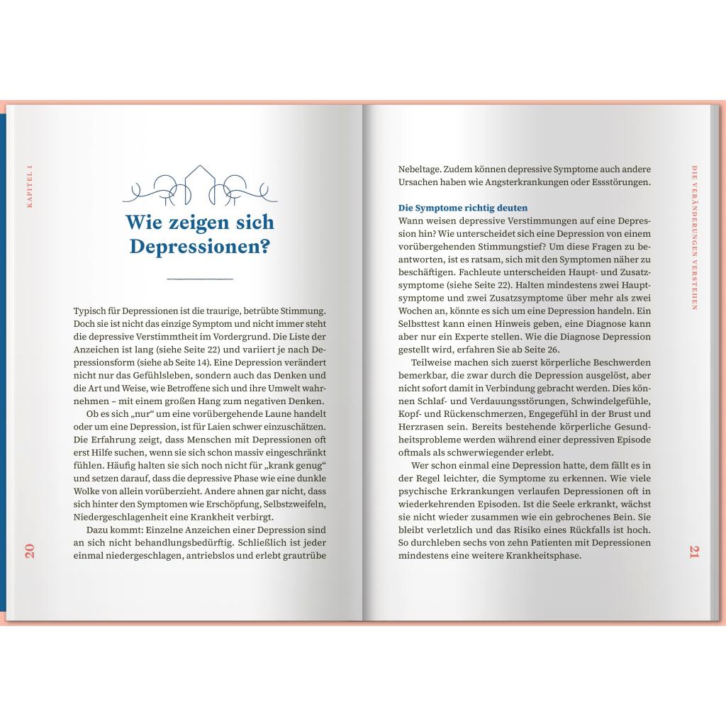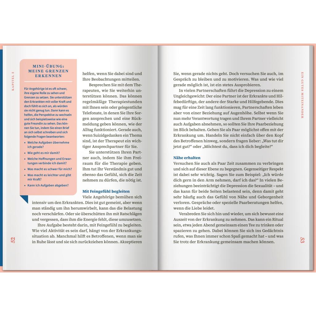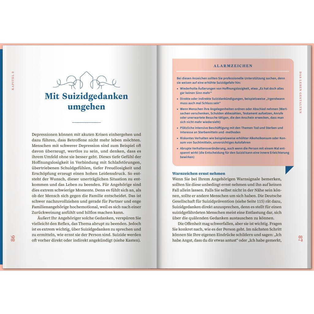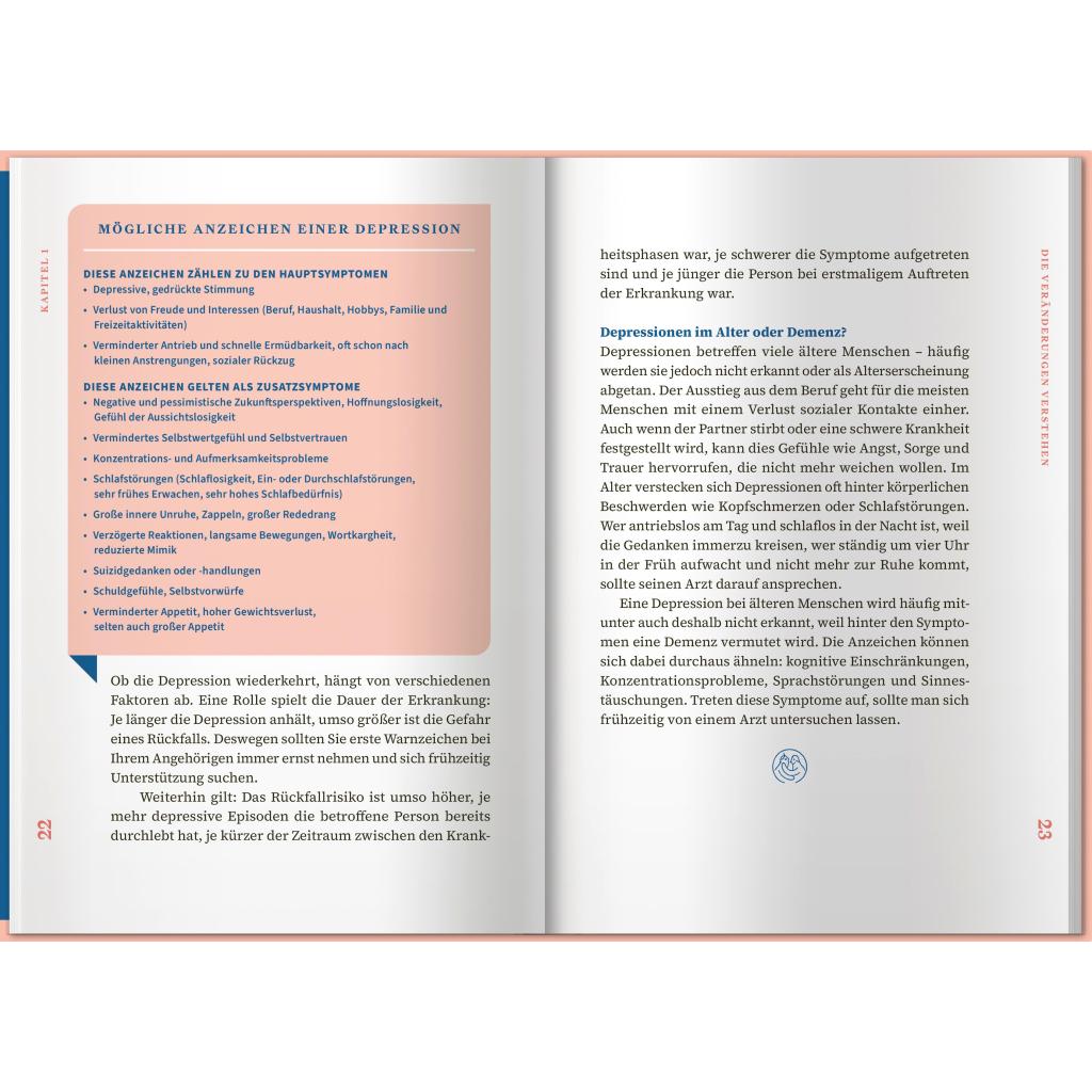 Eine Depression kann einen Menschen völlig verändern. So kann aus einer lebenslustigen Person auf einmal jemand werden, der völlig antriebslos durch das Leben irrt. Depressive Menschen leiden häufig an Schuldgefühlen, innerer Leere und Hoffnungslosigkeit und ziehen sich völlig aus der Beziehung oder aus Freundschaften zurück. Für Angehörige und Nahestehende ist das oft schwer zu auszuhalten. Oft entwickeln sie selbst negative Gefühle oder gar über den erkrankten Menschen. Überlastung und Erschöpfung sind oft die Folgen. Dieses Buch möchte Sie und Ihren Angehörigen auf dem weiteren Weg mit der Depression begleiten und Ihnen wie eine gute Freundin zur Seite stehen. In diesem Ratgeber erhalten Sie jede Menge Informationen rund um das Thema Depressionen. Sie erfahren viel Wissenswertes, das Ihnen im Alltag helfen und Ihrem Angehörigen Sicherheit, Vertrauen und Freude schenken kann. Darüber hinaus bekommen Sie einen Überblick über Unterstützungsmöglichkeiten für sich selbst.