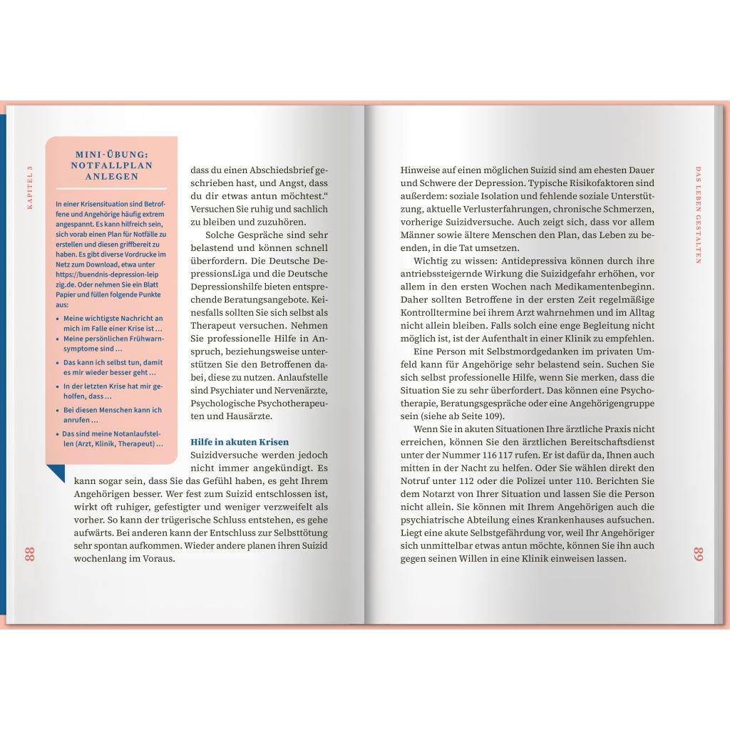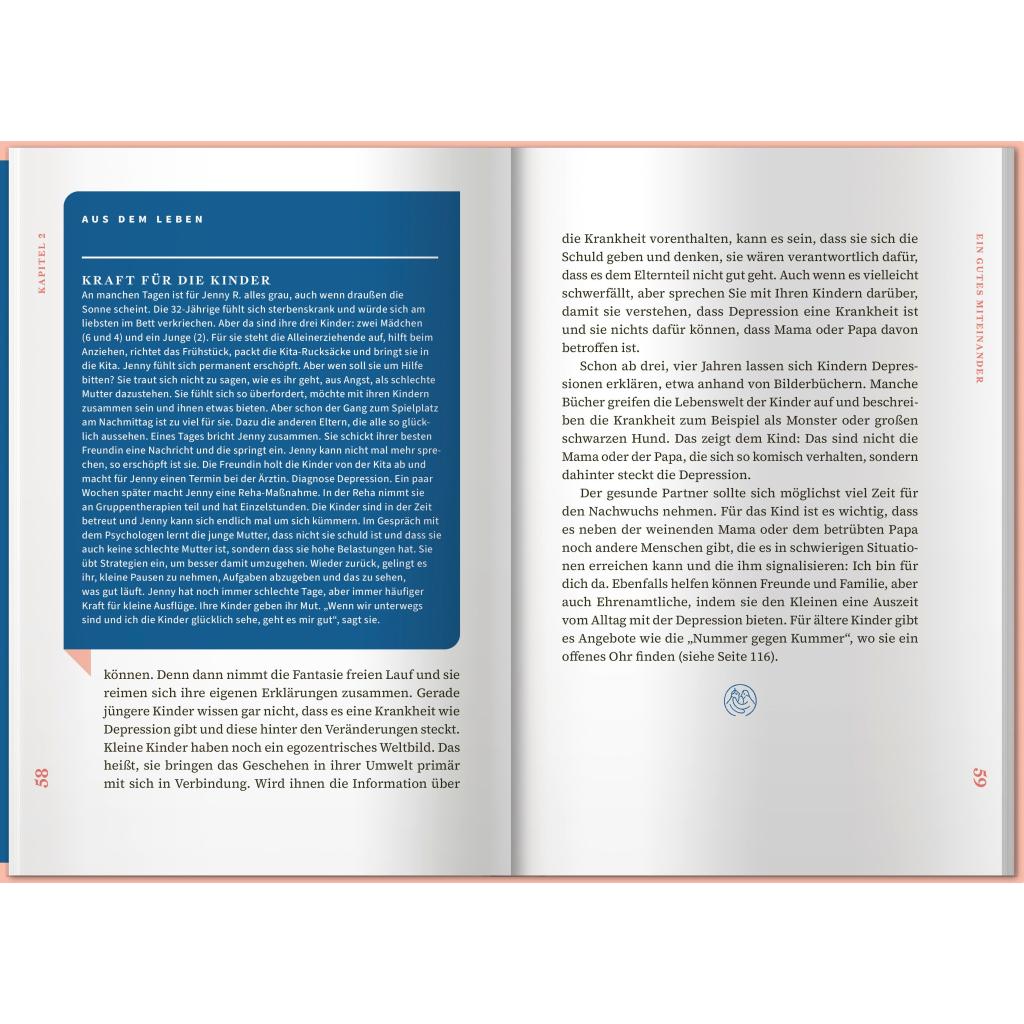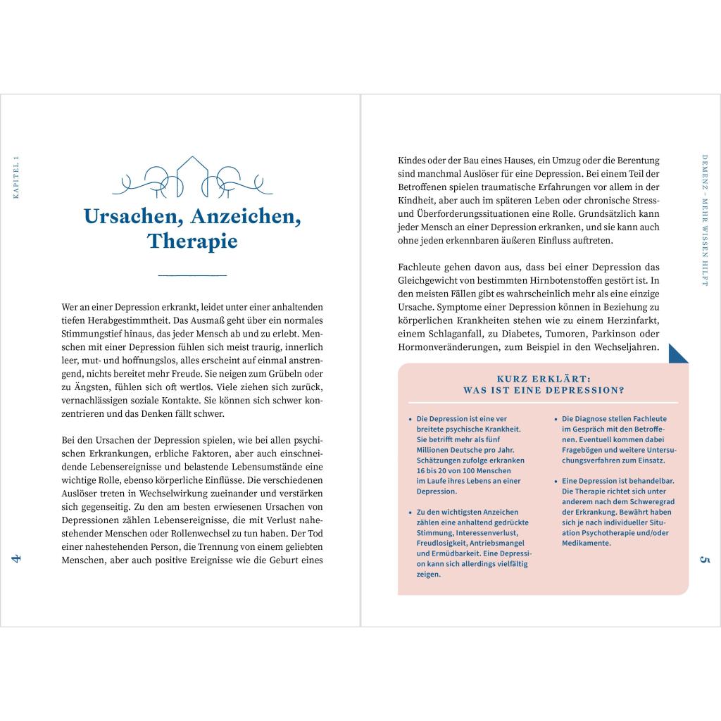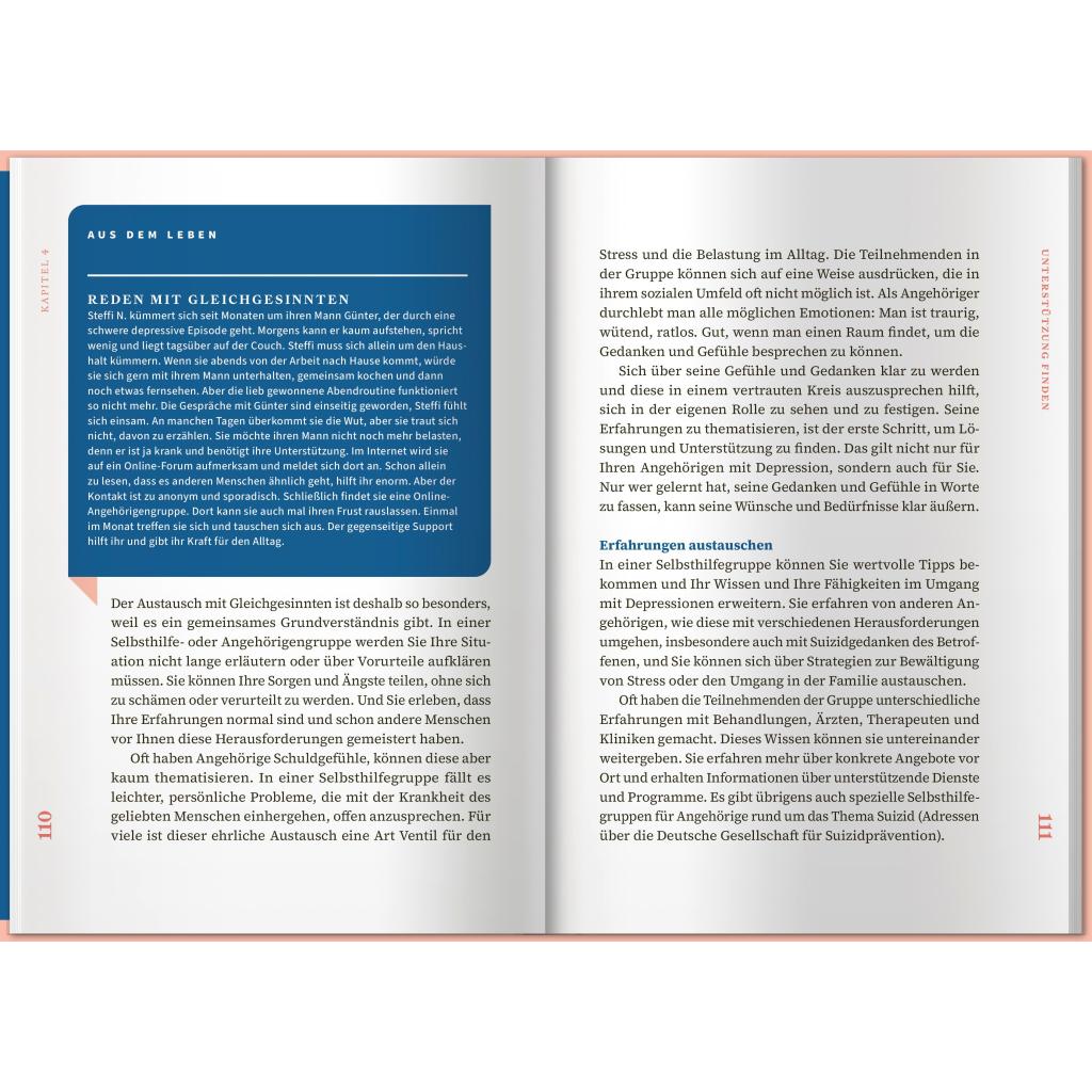 Eine Depression kann einen Menschen völlig verändern. So kann aus einer lebenslustigen Person auf einmal jemand werden, der völlig antriebslos durch das Leben irrt. Depressive Menschen leiden häufig an Schuldgefühlen, innerer Leere und Hoffnungslosigkeit und ziehen sich völlig aus der Beziehung oder aus Freundschaften zurück. Für Angehörige und Nahestehende ist das oft schwer zu auszuhalten. Oft entwickeln sie selbst negative Gefühle oder gar über den erkrankten Menschen. Überlastung und Erschöpfung sind oft die Folgen. Dieses Buch möchte Sie und Ihren Angehörigen auf dem weiteren Weg mit der Depression begleiten und Ihnen wie eine gute Freundin zur Seite stehen. In diesem Ratgeber erhalten Sie jede Menge Informationen rund um das Thema Depressionen. Sie erfahren viel Wissenswertes, das Ihnen im Alltag helfen und Ihrem Angehörigen Sicherheit, Vertrauen und Freude schenken kann. Darüber hinaus bekommen Sie einen Überblick über Unterstützungsmöglichkeiten für sich selbst.