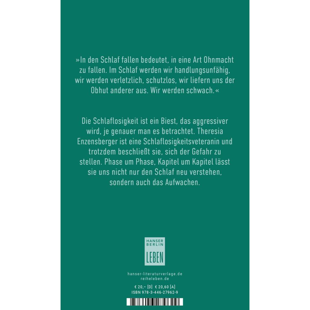 Das Leben lesen: Theresia Enzensbergers Buch ist ein philosophischer Streifzug durch die Nacht - und eine persönliche Erkundung der Schlaflosigkeit. Theresia Enzensberger kann nicht schlafen. Also schreibt sie ein Buch über den Schlaf und folgt dabei den verschiedenen Stadien, die wir in der Nacht durchleben. So beginnt sie in der zähneknirschenden Leichtschlafphase mit einem Essay über die Moralisierung von Schlaf, Traum als politische Metapher und die Folgen allgemeinen Schlafmangels. Fast unmerklich wird ihr Text in der Tiefschlafphase privater, innerlicher, und eröffnet uns eine intensivere, persönlichere Sicht auf die Welt, die Kunst, die Literatur. Der Traum kommt erst in der REM-Phase, hier verlässt sie den Raum des Realen und wagt etwas Neues. Ein aufregender, kluger, anregender Versuch, die Essenz eines menschlichen Grundbedürfnisses zu begreifen, das sich so sehr unserer Macht entzieht.