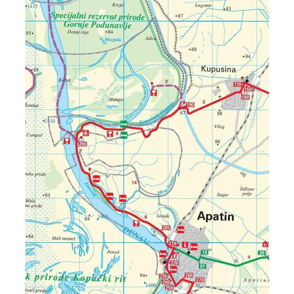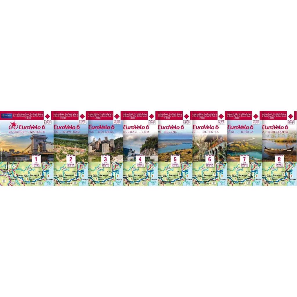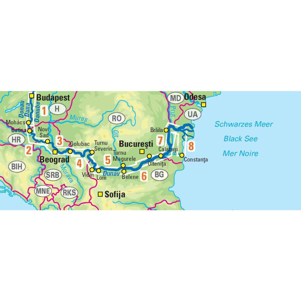 Au départ de Budapest, vous suivez sur 8 cartes le cours du Danube jusqu'à son embouchure le long de l'itinéraire EuroVelo 6. Vous découvrirez une nature intacte avec de nombreuses vallées de percée et de petits villages avec des églises orthodoxes. Depuis la ' Porte de fer ', vous pouvez suivre soit le côté bulgare, soit le côté roumain du fleuve, jusqu'à ce que l'itinéraire divisé soit finalement réuni à Ruse pour la dernière étape jusqu'à la mer Noire. L'EuroVelo 6 est actuellement le premier et le seul itinéraire EuroVelo entièrement disponible à l'échelle 1:100 000 au sein d'une série de cartes cyclistes. Les cartes pratiques suivent le tracé de l'itinéraire en 3 ensembles sur 24 feuilles de cartes d'une longueur totale de 42 mètres. Un concept bien pensé : la section de carte adaptée au cours de la rivière est suffisamment grande pour être lue sans problème à distance du guidon. Bien entendu, vous trouverez également d'autres informations utiles le long de l'itinéraire, comme par exemple des possibilités d'hébergement, des curiosités, des ateliers de réparation de vélos ou des extraits de plans de villes plus importantes.