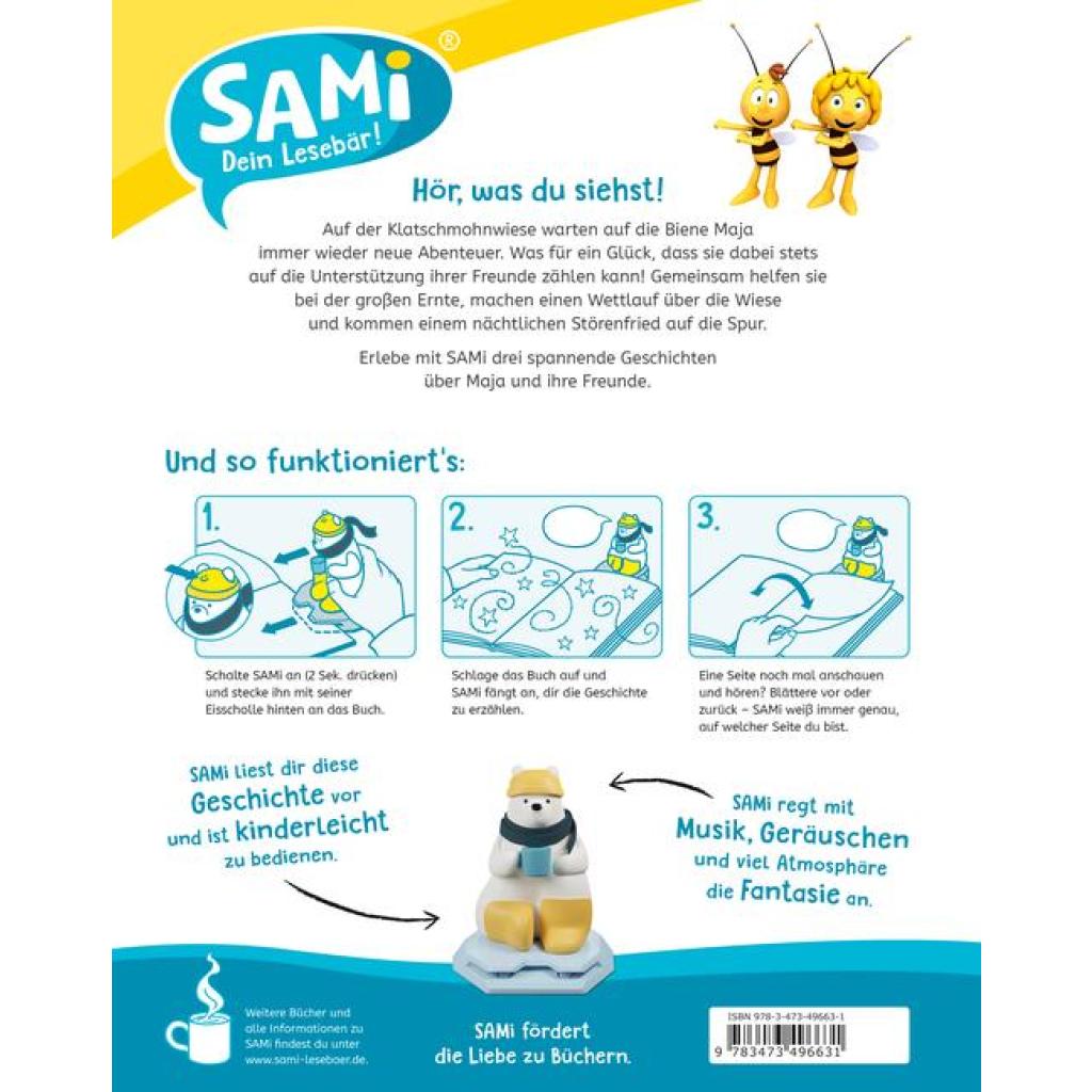 Erlebe mit SAMi ein Lese-Abenteuer! Auf der Klatschmohnwiese warten auf die Biene Maja neue Abenteuer. Was für ein Glück, dass sie dabei stets auf die Unterstützung ihrer Freunde zählen kann! Werden sie gemeinsam herausfinden, wer mit seinen ohrenbetäubenden Geräuschen allen Tieren den Schlaf raubt? Wer von Majas Freunden gewinnt den großen Wettlauf über die Wiese? Und schaffen sie es mit vereinten Kräften, rechtzeitig die Ernte der kostbaren Ackerwindenblüte einzuholen? Lesebär SAMI nicht enthalten. Muss separat erworben werden.