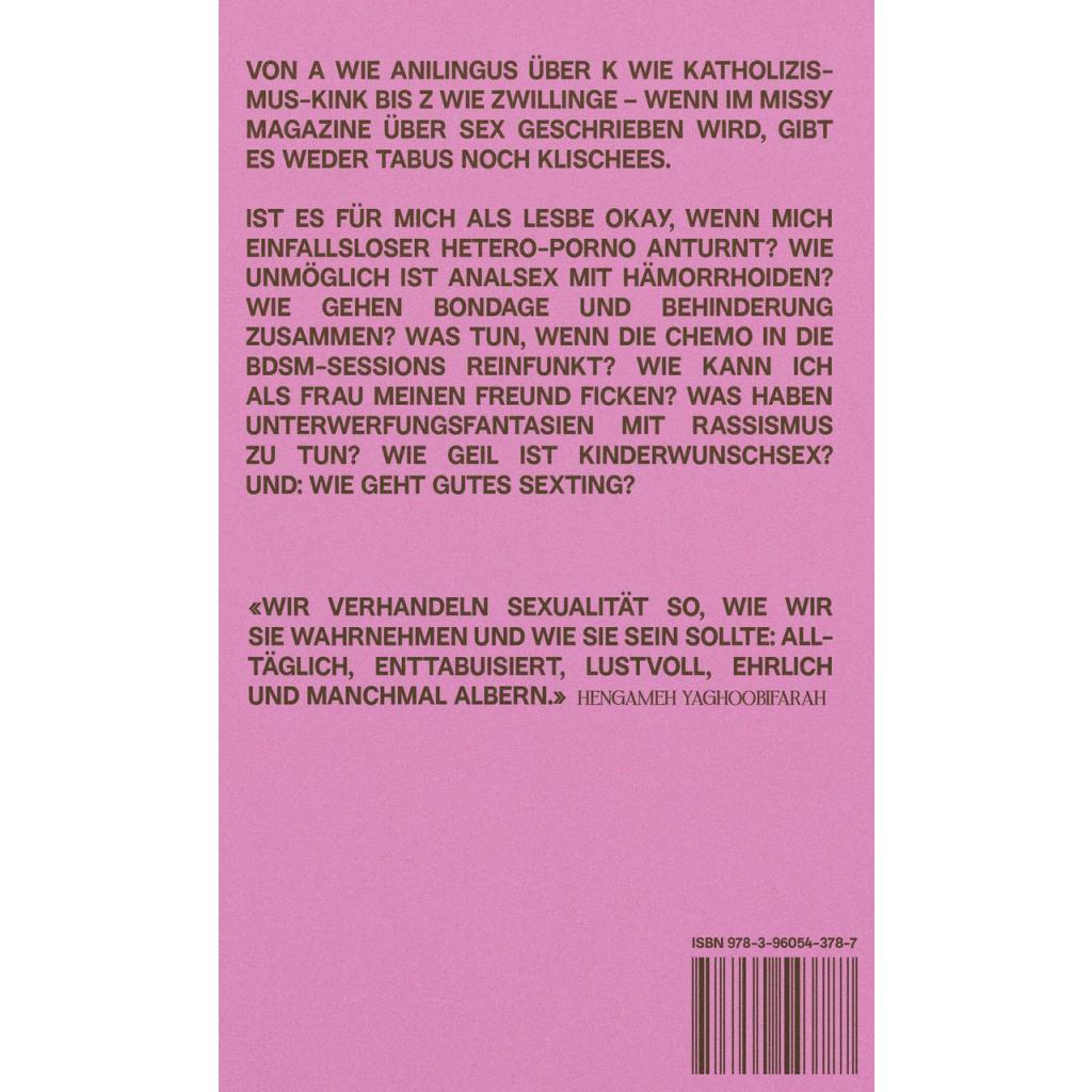Die Sexkolumnen aus dem Missy Magazine jetzt als Buch: Von A wie Anilingus über K wie Katholizismus-Kink bis Z wie Zwillinge - wenn in der Missy über Sex geschrieben wird, gibt es weder Tabus noch Klischees. Denn die Autor*innen schreiben über all die Dinge, die sie in ihrem sexuellen Erleben, ihren Beziehungen oder einfach nur in ihren Fantasien umtreiben: Ist es für mich als Lesbe okay, wenn mich einfallsloser Hetero-Porno anturnt? Wie unmöglich ist Analsex mit Hämorrhoiden? Wie gehen Bondage und Behinderung zusammen? Was tun, wenn die Chemo in die BDSM-Sessions reinfunkt? Wie kann ich als Frau meinen Freund ficken? Was haben Unterwerfungsfantasien mit Rassismus zu tun? Wie geil ist Kinderwunschsex? Und: Wie geht gutes Sexting? Die Texte beleuchten marginalisierte Fragestellungen rund um das Thema Sex, vermitteln Wissen und bauen Schambarrieren ab. Statt durch One-Size-Fits-All-Tipps Druck aufzubauen oder von einem homogenen Begehren auszugehen, liegt der Schwerpunkt auf Spaß, Neugierde und Selbstreflexion: 'Wir verhandeln Sexualität so, wie wir sie wahrnehmen und wie sie sein sollte: alltäglich, enttabuisiert, lustvoll, ehrlich und manchmal albern.' Mit Beiträgen von Laura Méritt, Stefanie Lohaus, Anna Mayrhauser, Evan Tepest, Kirsten Achtelik, Jacinta Nandi, Mithu Sanyal, Leona Stahlmann u.a.