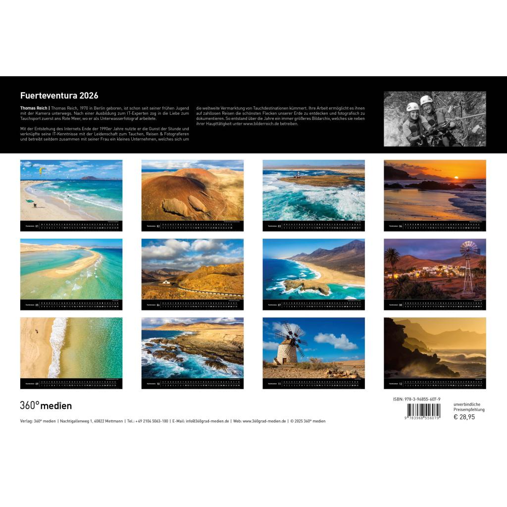 Aus traumhaften Fuerteventura-Aufnahmen des Fotografen Thomas Reich hat die Redaktion von 360° medien die 13 schönsten Motive ausgewählt und in diesem Kalender zusammen gestellt. Präsentiert werden die Fotos auf hochwertigem Papier im Format 50 cm x 35 cm.