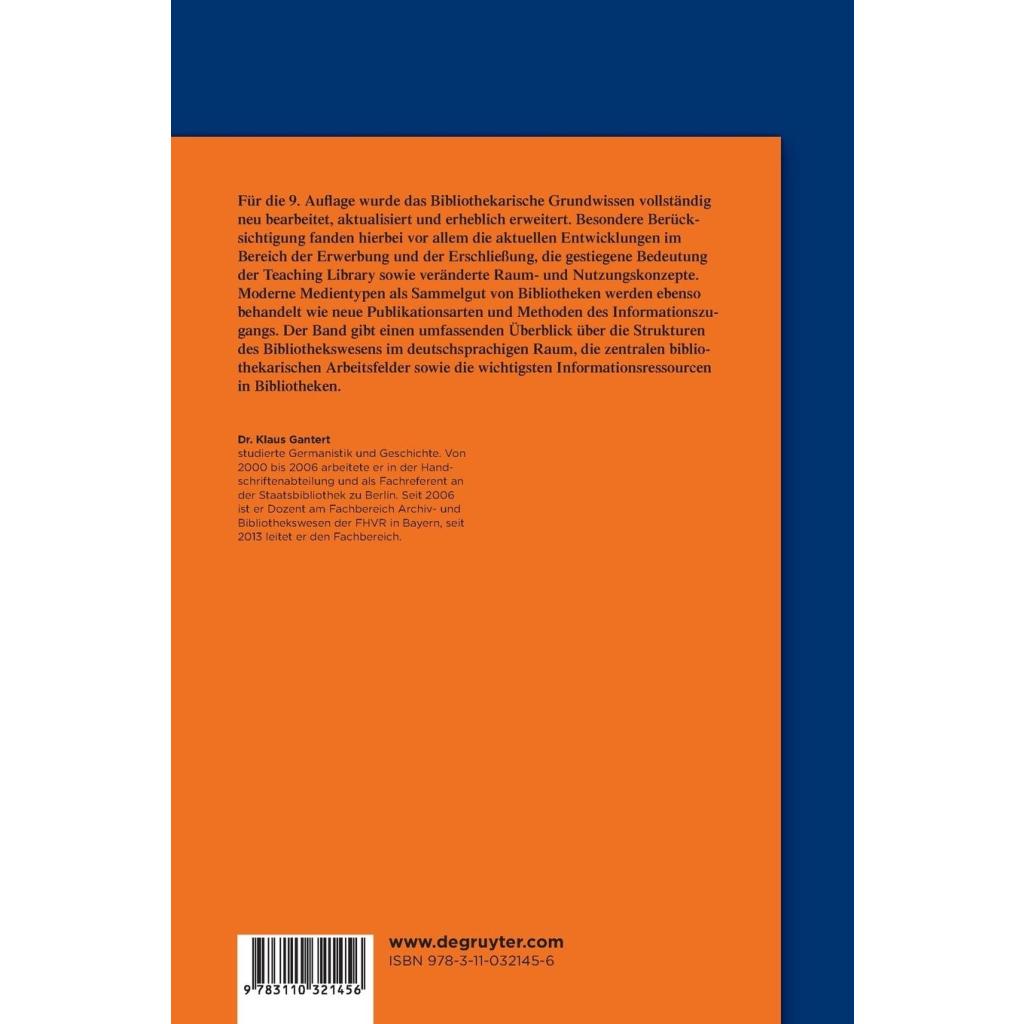 Für die 9. Auflage wurde das Bibliothekarische Grundwissen vollständig neu bearbeitet, aktualisiert und erheblich erweitert. Besondere Berücksichtigung fanden hierbei vor allem die aktuellen Entwicklungen im Bereich der Erwerbung und der Erschließung, die gestiegene Bedeutung der Teaching Library sowie veränderte Raum- und Nutzungskonzepte. Moderne Medientypen als Sammelgut von Bibliotheken werden ebenso behandelt wie neue Publikationsarten und Methoden des Informationszugangs. Der Band gibt einen umfassenden Überblick über die Strukturen des Bibliothekswesens im deutschsprachigen Raum, die zentralen bibliothekarischen Arbeitsfelder sowie die wichtigsten Informationsressourcen in Bibliotheken. Die 10., vollständig aktualisierte und erweiterte Ausgabe des Bibliothekarisches Grundwissens ist für das Frühjahr 2025 geplant. Prof. Dr. Klaus Gantert studierte Germanistik und Geschichte. Von 2000 bis 2006 arbeitete er in der Handschriftenabteilung und als Fachreferent an der Staatsbibliothek zu Berlin. Von 2006 bis 2019 war er als Dozent und Leiter am Fachbereich Archiv- und Bibliothekswesen der HföD in Bayern tätig. Seit 2019 ist er Professor für Bibliothekswissenschaft mit Schwerpunkt Informationssysteme an der Hochschule Hannover.