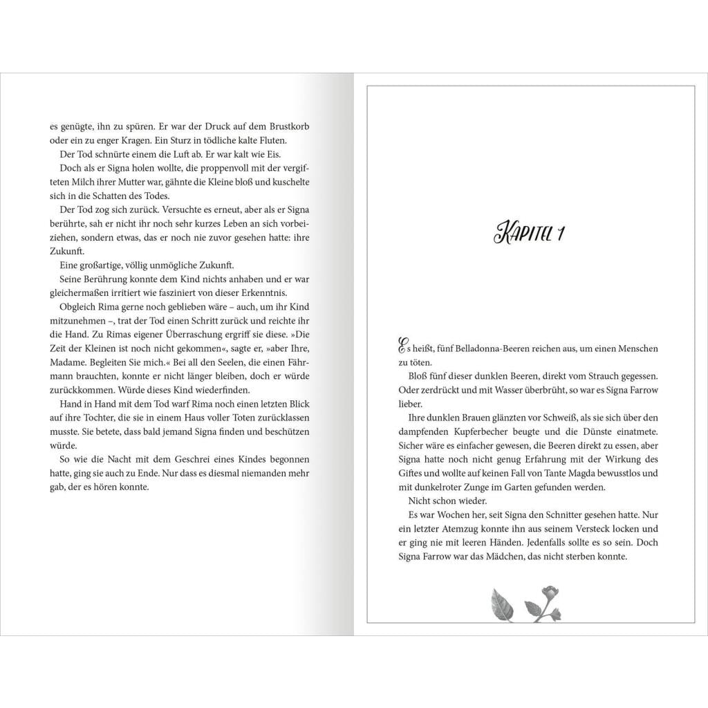 Eine verbotene Liebe und ein Geheimnis, das alles zerstören könnte ... Signa ist vom Tod berührt. Seit ihre Eltern gestorben sind, glauben ihre Verwandten, dass sie verflucht ist. Bis Signa eines Tages von ihrem Cousin in das wunderschöne Herrenhaus Thorn Grove eingeladen wird. Die rauschenden Bälle und eleganten Gäste faszinieren Signa, doch der Glanz verbirgt ein düsteres Geheimnis. Die Tochter des Hauses, Blythe, wurde vergiftet und der Täter steht der Familie näher als vermutet. Als der Tod dann höchstpersönlich erscheint, um Signa bei dem Rätsel zu helfen, weckt er in ihr verbotene Gefühle, die sie in einen dunklen Abgrund reißen könnten ... Der Auftakt einer romantischen Trilogie und einer Enemies-to-Lovers-Geschichte, die fesselt! Dieses Buch gibt es in zwei Versionen: mit und ohne Farbschnitt. Sobald die Farbschnitt-Ausgabe ausverkauft ist, liefern wir die Ausgabe ohne Farbschnitt aus.
