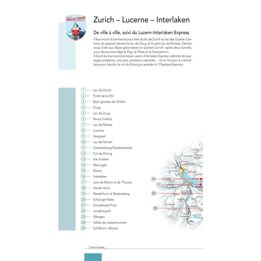 DIE GRAND TRAIN TOUR OF SWITZERLAND führt auf 1280 km über die attraktivsten Bahnstrecken kreuz und quer durch die Schweiz und verbindet die schönsten Panoramazüge und Sehenswürdigkeiten des Landes. Der beliebte Touring Guide Grand Train Tour of Switzerland zu dieser Zug-Rundreise gibt's neu auch auf Französisch und besticht durch unzählige Reisetipps und Hintergrundinformationen zu den einzelnen Strecken. Egal ob nur ein Teil oder die gesamte Grand Train Tour gemacht wird - Mit den Routenkarten, den detaillierten Reiseinformationen, den Sehenswürdigkeiten und Bahn-Besonderheiten je Etappe wird man bestens auf die Reise vorbereitet. Mit