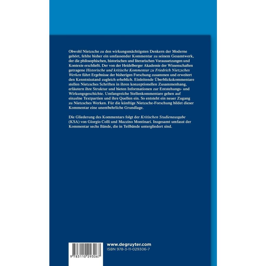 Der Band 4.2 enthält den Kommentar zum dritten und vierten Teil von Nietzsches Also sprach Zarathustra . Entstanden in den Jahren 1883 bis 1885 handelt es sich um das populärste Werk Nietzsches, das aufgrund seiner poetischen Form und seiner Rätselhaftigkeit enorme Strahlkraft entfaltet hat, aber auch, weil es mit dem "Übermenschen" und der "ewigen Wiederkunft" zentrale Konzepte Nietzsches vorstellt.
