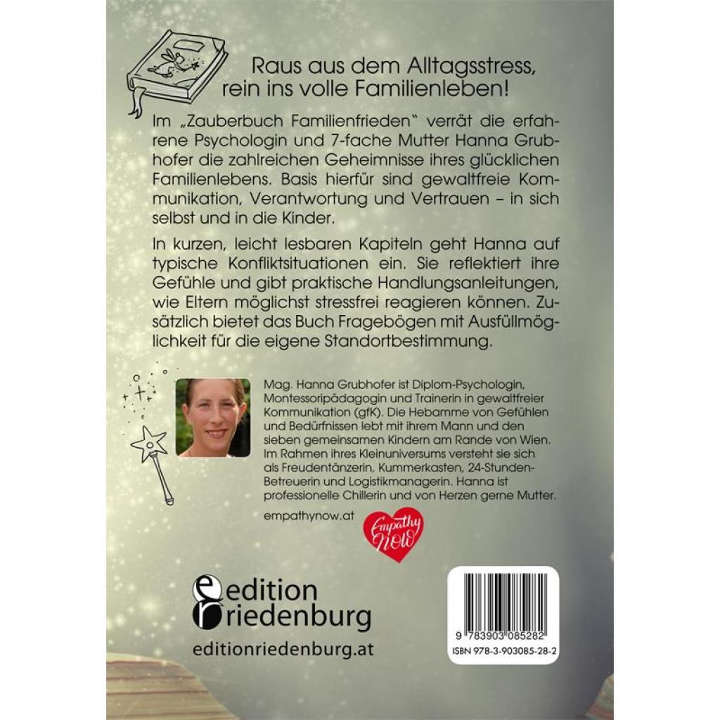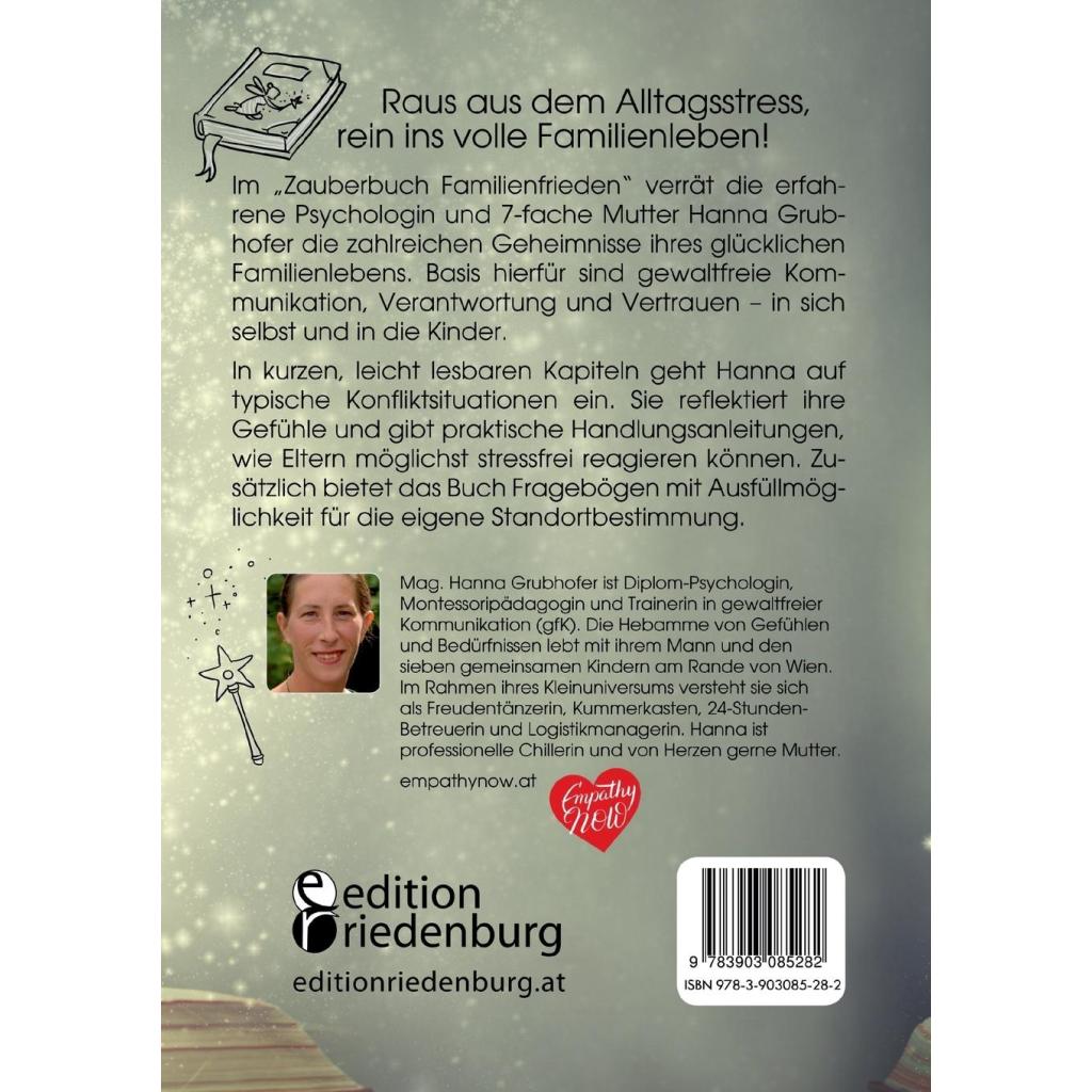 Raus aus dem Alltagsstress, rein ins volle Familienleben! Im ¿Zauberbuch Familienfrieden¿ verrät die erfahrene Psychologin und 7-fache Mutter Hanna Grubhofer die zahlreichen Geheimnisse ihres glücklichen Familienlebens. Basis hierfür sind gewaltfreie Kommunikation, Verantwortung und Vertrauen ¿ in sich selbst und in die Kinder. In kurzen, leicht lesbaren Kapiteln geht Hanna auf typische Konfliktsituationen ein. Sie reflektiert ihre Gefühle und gibt praktische Handlungsanleitungen, wie Eltern möglichst stressfrei reagieren können. Zusätzlich bietet das Buch Fragebögen mit Ausfüllmöglichkeit für die eigene Standortbestimmung.