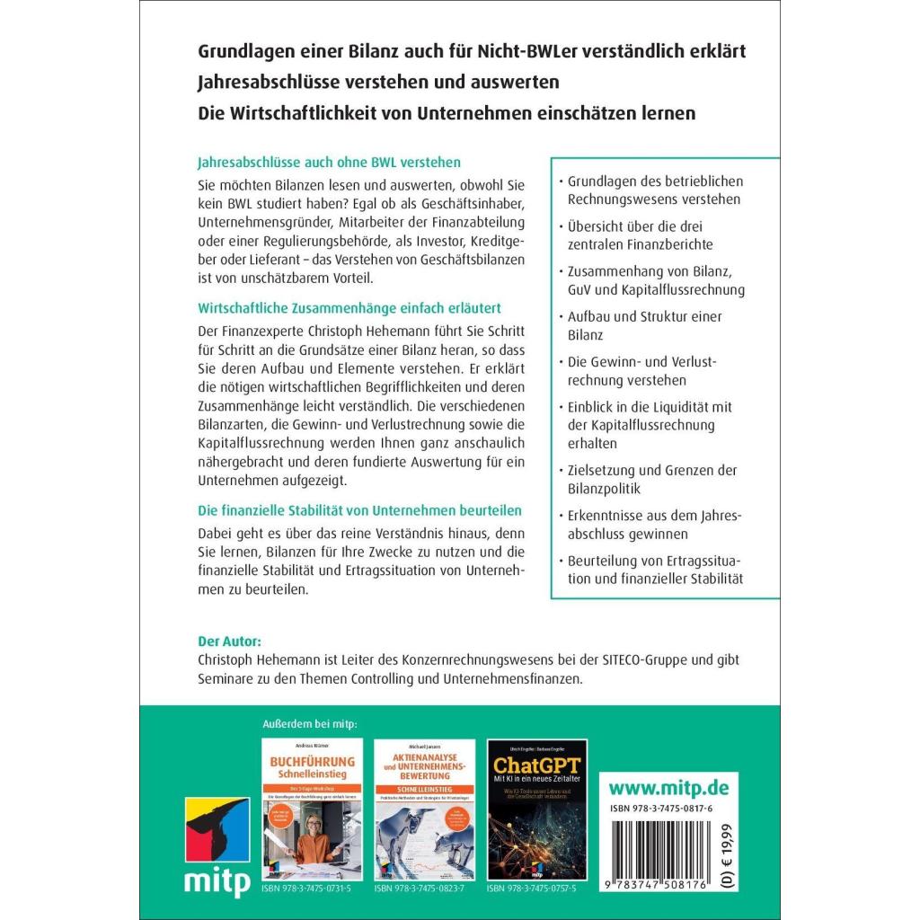 | Keyword: | Finanzen; abschreibungen; benchmarking; bestandskonto; bilanz; bilanzanalyse; bilanzen; bilanzen lesen; buch; buchführung; buchhaltung; bücher; cashflow; eigenkapital; erfolgskonto; finanzanlage; finanzwesen; gewinn und verlustrechnung; inventar; jahresabschluss; kapitalflussrechnung; kapitalwertmethode; kostenarten; liquidität; mitp; rechnungswesen; rendite; rentabilität; rückstellung; shareholder value; steuer; verbindlichkeiten; working capital; working capital management |