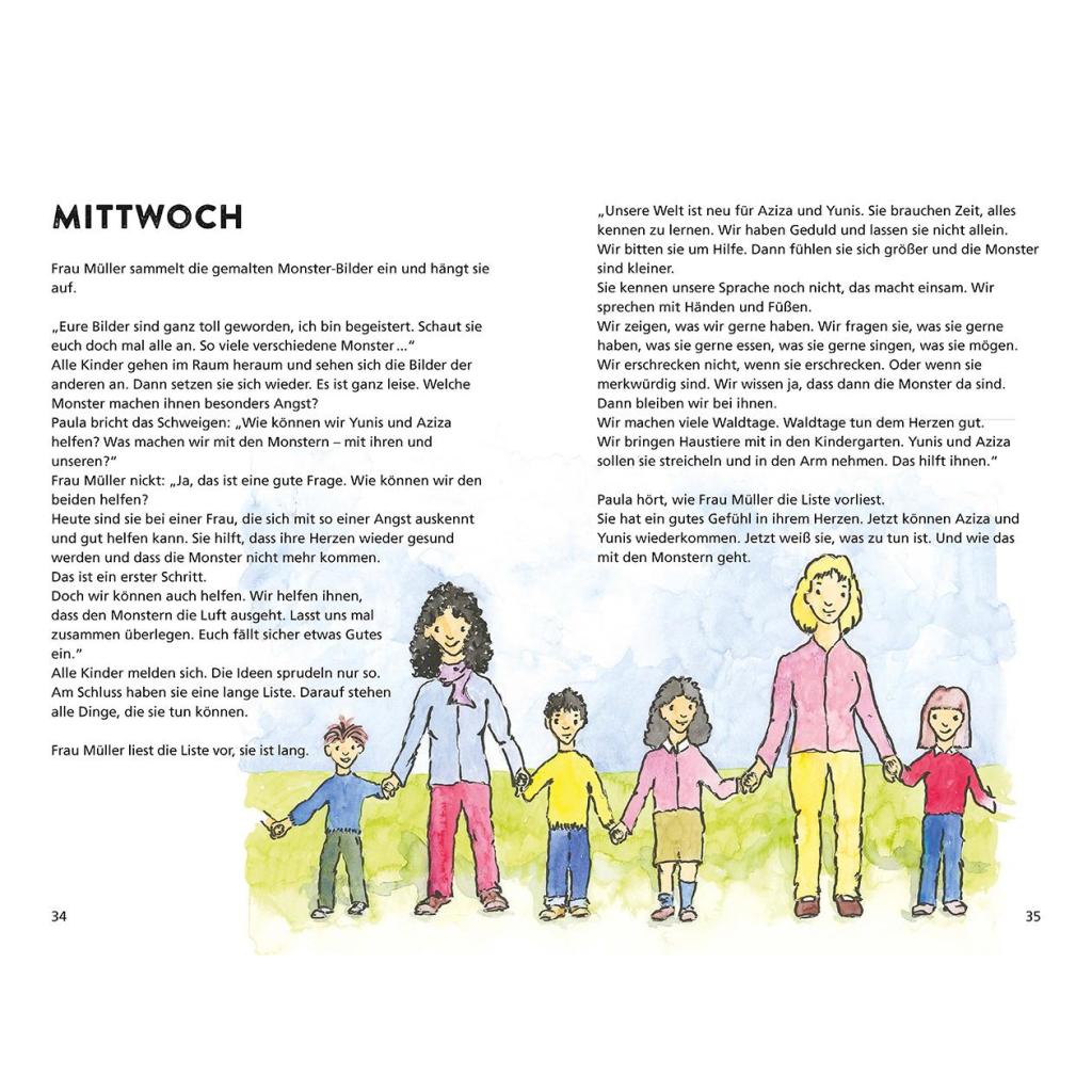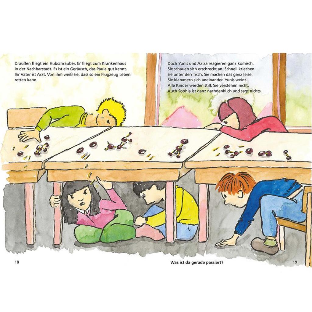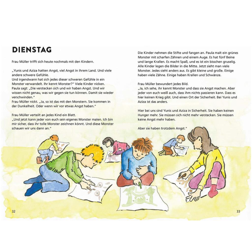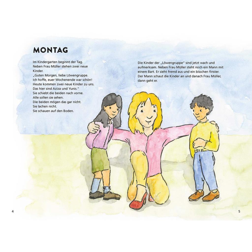 Im Kindergarten beginnt der Tag. Neben Frau Müller, der Kindergärtnerin, stehen zwei neue Kinder: Aziza und Yunis. Die Geschwister sind erst seit drei Monaten in Deutschland. Sie haben eine lange Reise hinter sich, die auch manchmal gefährlich war. Yunis und Aziza sind Flüchtlingskinder. Sie sind in sich gekehrt und reden kaum. Wie Erwachsene und Kinder mit ihnen umgehen können, zeigt dieses sensible Kinderfachbuch auf. Ein Fachteil erklärt Hintergründe von Flucht und Trauma. Darüber hinaus gibt er Tipps, wie es gelingen kann, Flüchtlingskindern und deren Familien wieder Sicherheit und Freude zu vermitteln. Das Buch richtet sich an alle, die Kindern das Thema Flucht und Trauma behutsam und verständlich erklären wollen. Für Kinder ab 3 Jahren. + Downloadmaterial zum Ukraine-Krieg