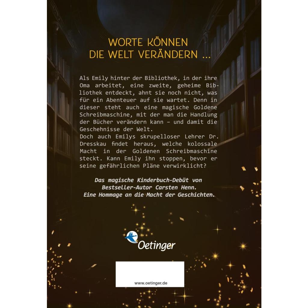 Bücher können die Welt verändern Als Emily hinter der Bibliothek, in der ihre Oma arbeitet, eine zweite, geheime Bibliothek entdeckt, ahnt sie noch nicht, in was für ein Abenteuer sie geraten ist. In dieser Bibliothek steht nämlich jedes Buch, das je auf der Welt geschrieben worden ist. Und dort steht auch eine magische goldene Schreibmaschine. Emily erfährt: Wenn man auf dieser Schreibmaschine Dinge schreibt und sie in die Bücher in der Bibliothek einklebt, ändert sich deren Handlung - und über diese Änderungen lässt sich auch in die Realität eingreifen. Doch auch Emilys skrupelloser Lehrer Dresskau findet heraus, welche kolossale Macht in der Bibliothek steckt. Kann Emily ihn stoppen, bevor er seine gefährlichen Pläne verwirklicht? Die Goldene Schreibmaschine: Das magische Kinderbuch-Debüt von Carsten Henn Magischer Realismus: Carsten Henns fantastischer Abenteuerroman für Kinder ab 10 Jahren ist eine faszinierende Mischung aus magischer Fantasy und realistischen Elementen, die die Grenzen zwischen der realen Welt und der Welt der Bücher verschwinden lässt. Große Bücherliebe: Eine Hommage an die Macht der Geschichten - wie sie uns prägen und unsere Realität gestalten. Starke Protagonistin: Die kleine Emily zeigt, wie wichtig es ist, für das Gute einzustehen und mutig seine Stimme zu erheben. Erstes Kinderbuch eines Bestseller-Autors: In seinem ersten Kinderbuch entführt Carsten Henn Kinder ab 10 Jahren in die magische Welt der Bücher und der Literatur. Ausgezeichnet mit dem LovelyBooks Community Award. Die einzigartige Geschichte regt zum Nachdenken und Träumen an und ist auch für Erwachsene geeignet.