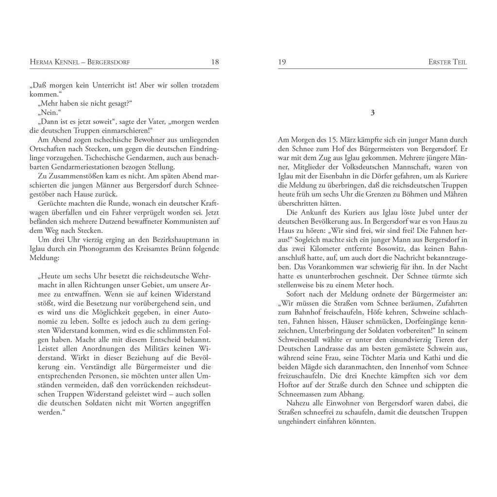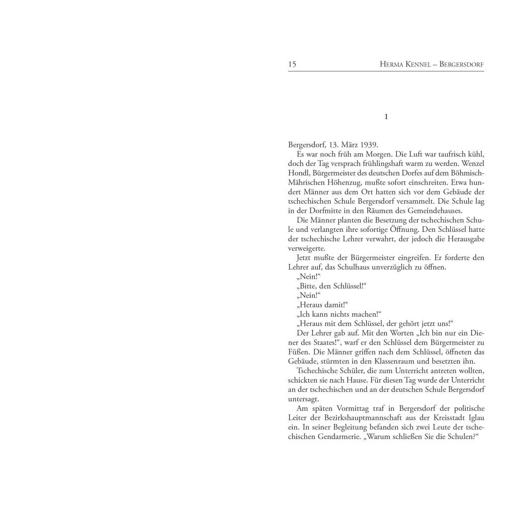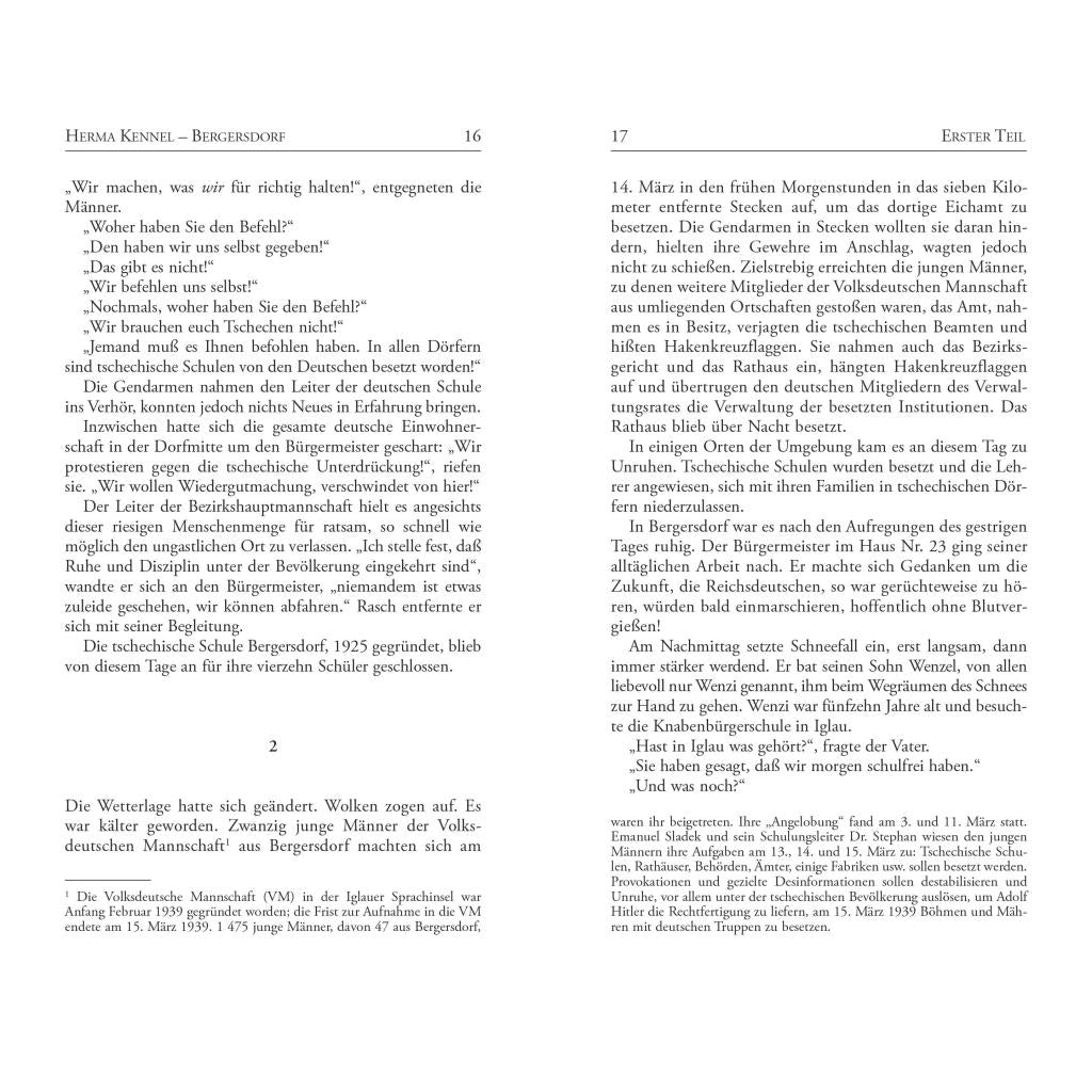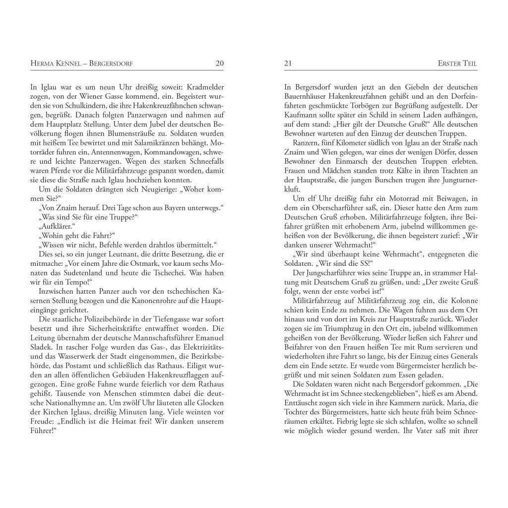 15. März 1939. Hitlers Wehrmacht marschiert in die "Rest-Tschechei" ein. In der deutschen Sprachinsel Iglau feiern die Bewohner den Einmarsch als Befreiung. Der Chef des SS-Hauptamtes, Gottlob Berger, reist aus Berlin an und erklärt "sein" Bergersdorf zu einem SS-Dorf. Ohne sich viele Gedanken zu machen, treten nun die meisten Männer der All¬ge¬meinen SS bei. Auch der Bürgermeister der Ortschaft, Wenzel Hondl, kann sich dem Geschehen nicht entziehen. Doch die Szene verfinstert sich zunehmend, und immer mehr Mütter trauern um ihre gefallenen Söhne. Bitter muß Bürgermeister Hondl erkennen: "Wir wollten uns von den Tschechen befreien und sind Hitler in die Hände gefallen." Im Mai 1945 kommt es schließlich zur Katastrophe ... Herma Kennel hat die brutalen Ereignisse in ihrem Tatsachenroman mit größter Objektivität erzählt. Ihr Buch löst schließlich Polizeiermittlungen aus und läßt die Behörden das im Roman erwähnte Massengrab öffnen. Wochenlang berichten die tschechische und internationale Presse von der "Budinka"-Wiese, die bald zu einem Symbol der verdrängten Nachgeschichte des Weltkriegs wird. In einem kurzweiligen Nachwort blickt die Autorin erstmals auf die Folgen zurück, die das Erscheinen ihres Werkes auslöste.