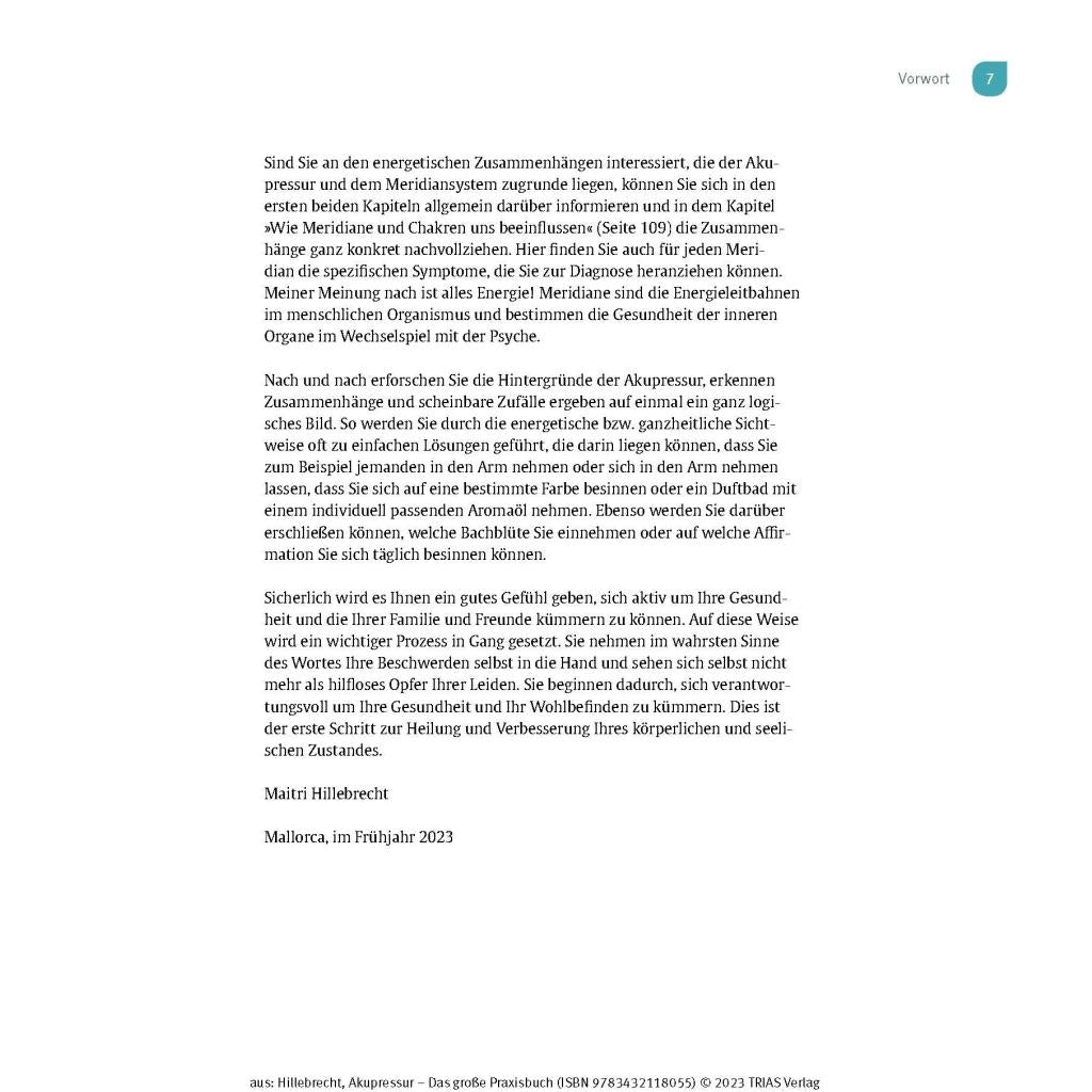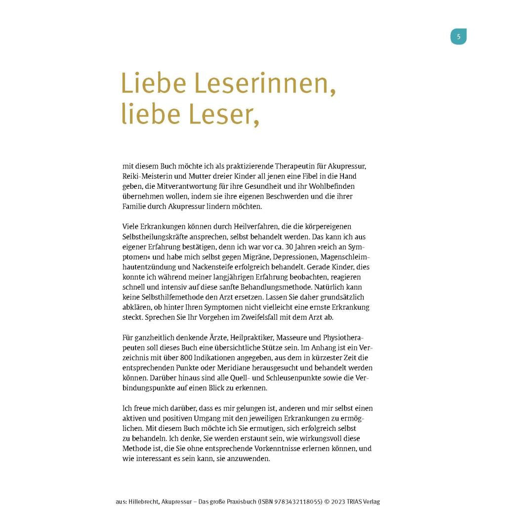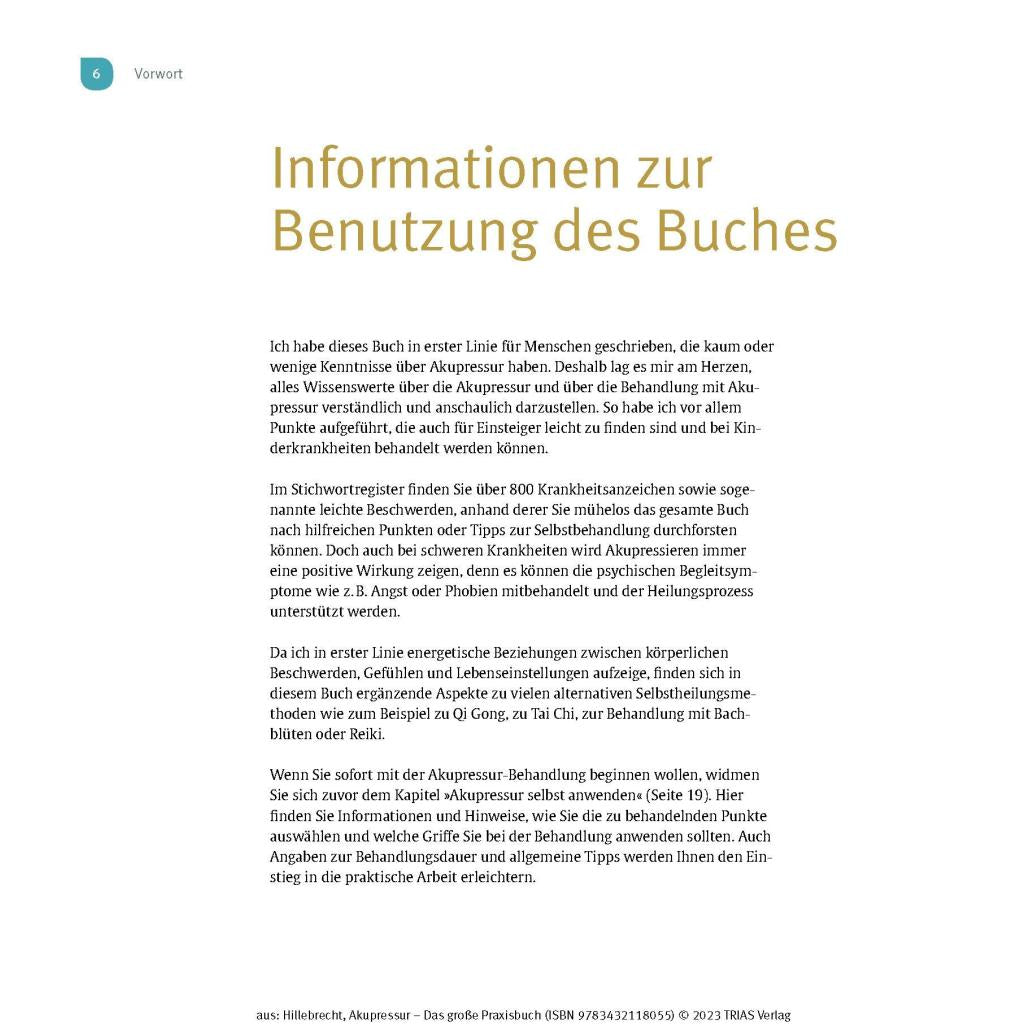 Selbstheilung durch Fingerdruck Rückenschmerzen, Kopfschmerzen, Schlafstörungen oder Übelkeit – Akupressur hilft bei vielen Beschwerden und Schmerzen und gilt als die sanfte Variante der Akupunktur. Die schnell wirksame Fingerdruck-Massage aus der Traditionellen Chinesischen Medizin (TCM) können Sie ganz einfach selbst anwenden. Die Akupresseurin Maitri Hillebrecht ist durch diese Selbsthilfemethode seit vielen Jahren trotz schwerer Migräne schmerzfrei. Ihre langjährigen Erfahrungen und konkreten Anleitungen für alle relevanten Akupressur-Punkte gibt sie in diesem hervorragend bebilderten Praxisbuch weiter. Aktivieren Sie Ihre Selbstheilungskräfte – von Kopf bis Fuß. - Für über 800 Indikationen: Beschwerden einfach schnell nachschlagen und selbst behandeln. - Druckpunkte sofort finden: Viele anschauliche Fotos und Illustrationen zeigen Ihnen, wo genau Sie drücken müssen. - Mit Körper und Geist im Einklang: So hängen Druckpunkte, Meridiane und Chakren zusammen Ein Muss auch für Masseure, Physiotherapeuten, Heilpraktiker und ganzheitlich tätige Ärzte