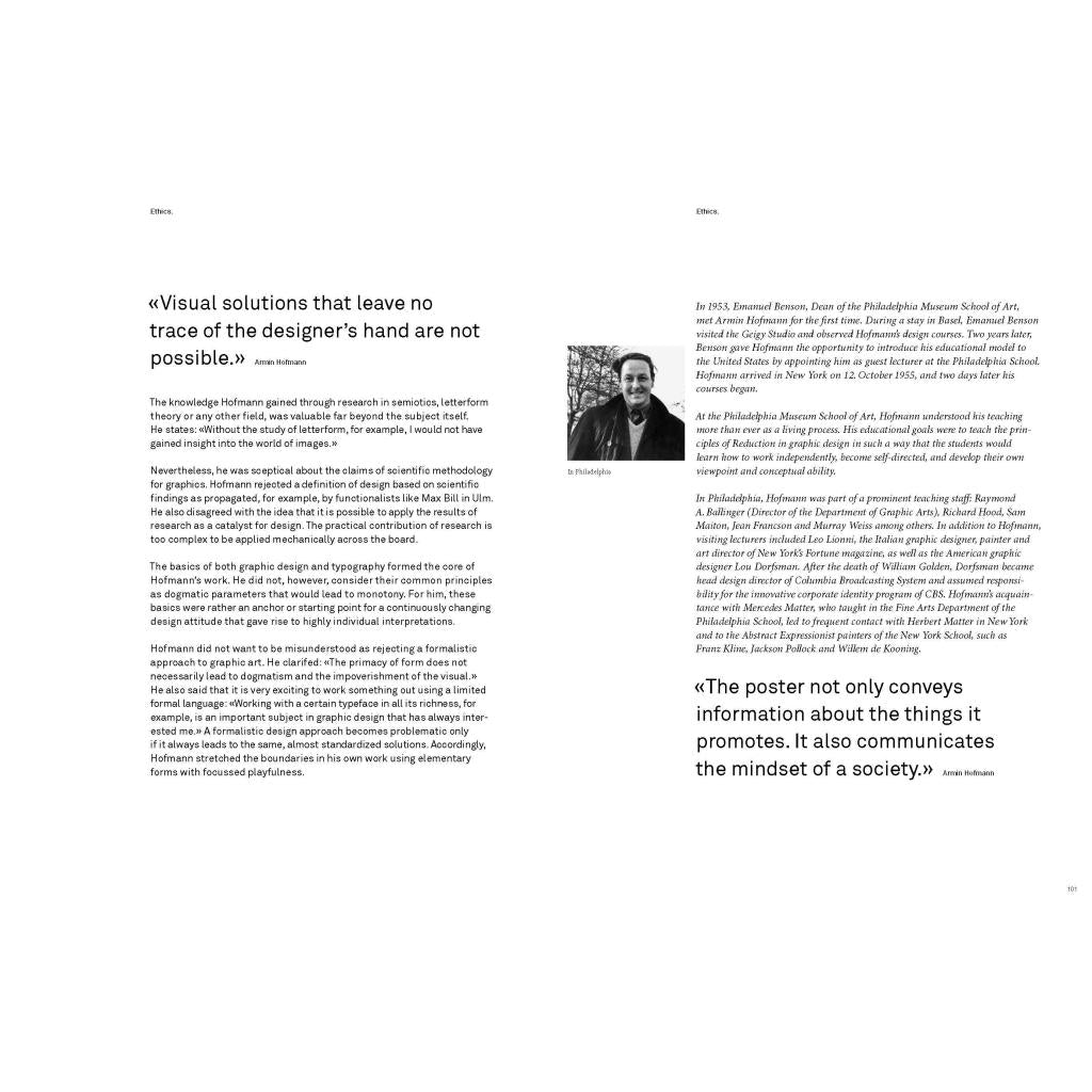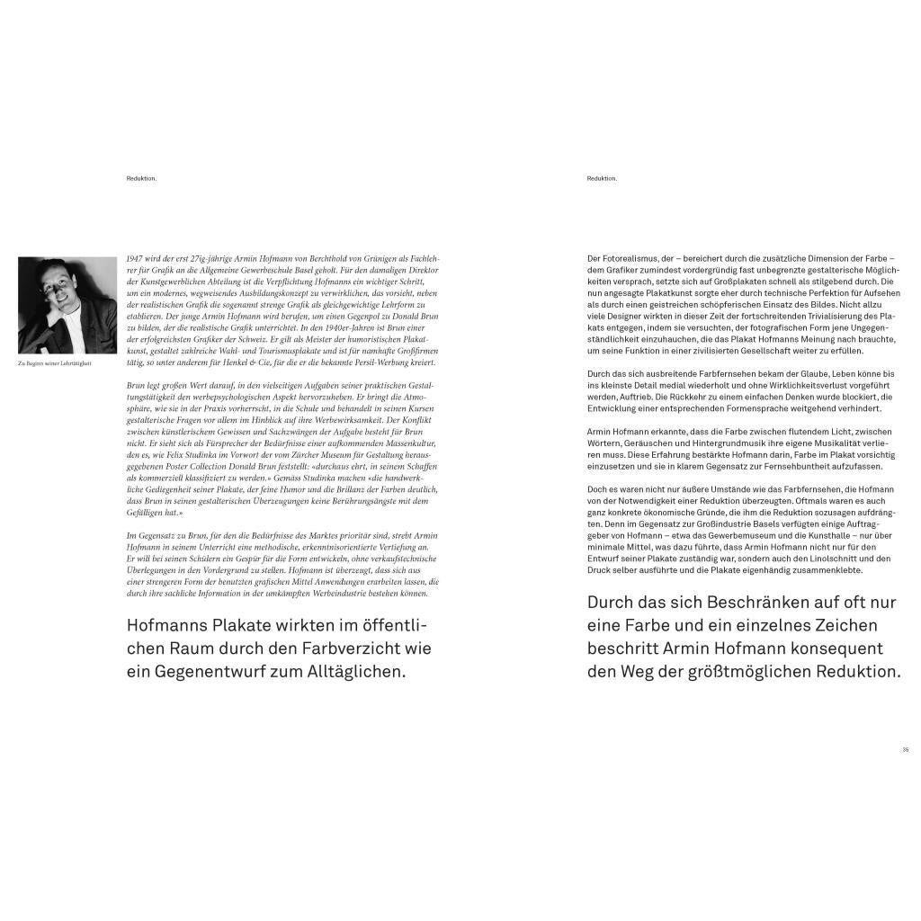 Armin Hofmann hat mit seinem grafischen Werk und seinen didaktischen Ansätzen Generationen von Grafikdesignern auf der ganzen Welt beeinflusst. Fernab von doktrinären Ansichten lebte er eine professionelle Haltung vor, die von der Idee der Reduktion, einem sachbezogenen Pragmatismus und einem tiefen Verantwortungsgefühl geprägt war. Diese Publikation gibt einen umfassenden Überblick über sein gestalterisches Werk, seine berufsethischen Überzeugungen und die von ihm entwickelten und in der Lehre angewandten Grundsätze. Das Werk baut sich auf drei Ebenen auf: der fachlichen Auseinandersetzung mit Hofmanns Arbeiten, seiner Biografie und Originaltexten über verschiedene Aspekte seines Schaffens. Gastbeiträge von ehemaligen Studenten und später renommierten Grafikdesignern und Typografen sowie Mitstreitern und Kollegen zeichnen ein sehr persönliches Bild und illustrieren anhand deren eigener Arbeiten den weltweiten Einfluss seines Werks. Bei der Erarbeitung wurde fast ausschließlich auf Originalquellen zurückgegriffen, insbesondere aus dem umfangreichen Privatarchiv, wodurch ein sehr authentisches, tiefgehendes und facettenreiches Eintauchen in das Vermächtnis von Armin Hofmann möglich wird.