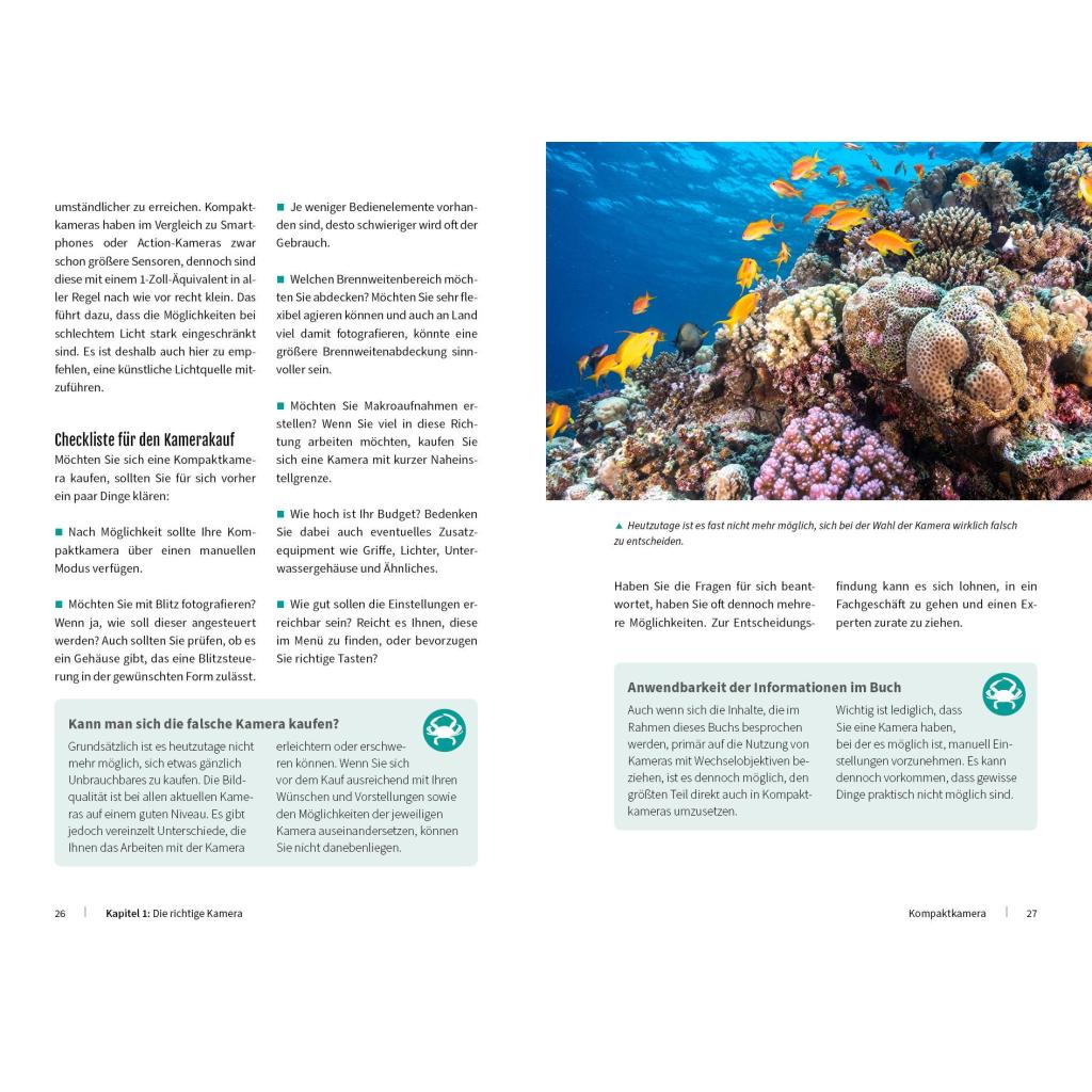 Verborgene Welten in spektakulären Bildner festhalten - so geht's Ausrüstung, Know-how und Tipps: alles, was Sie brauchen und wissen müssen Tauchen ist für viele ein Traum. Die schönsten Momente Unterwasser einzufangen, ist aber selbst für erfahrene Fotografen eine Herausforderung. Denn auch abseits der reinen Fotografie gibt es vieles zu beachten. Dieses Praxisbuch gibt Ihnen das Handwerkszeug mit auf den Weg, das Sie für beeindruckende Unterwasserbilder benötigen. Tauchen Sie zusammen mit Toby Horn in die Grundlagen von Ausrüstung , Kameratechnik und Einstellungen ein und holen Sie sich Anregungen zu Licht, Bildgestaltung u. v. m. Ihr neues Wissen vertiefen Sie mit gezielten Übungen , damit Sie auch schwierige Situationen innerhalb der begrenzten Tauchzeit meistern. Freuen Sie sich auf bewährte Tipps des Profis - für einzigartige Aufnahmen mit "Tiefenschärfe". Aus dem Inhalt: Auswahl des richtigen Equipments Wichtiges zum Unterwassergehäuse Fotografieren im Meer und in Seen Trainieren der Tauchfähigkeiten Tauchgang: Vor- und Nachbereitung Richtiger Umgang mit Flora & Fauna Bildwinkel & -gestaltung Unterwasser Sichtweisen und Lichtverhältnisse Situative Herangehensweisen Kamerahandling beim Tauchen Geheimnisse guter Unterwasserfotos Arbeiten mit manueller Belichtung Lampen und Blitzlicht zum Aufhellen Kreative Bildbearbeitung Pflege und Wartung der Ausrüstung