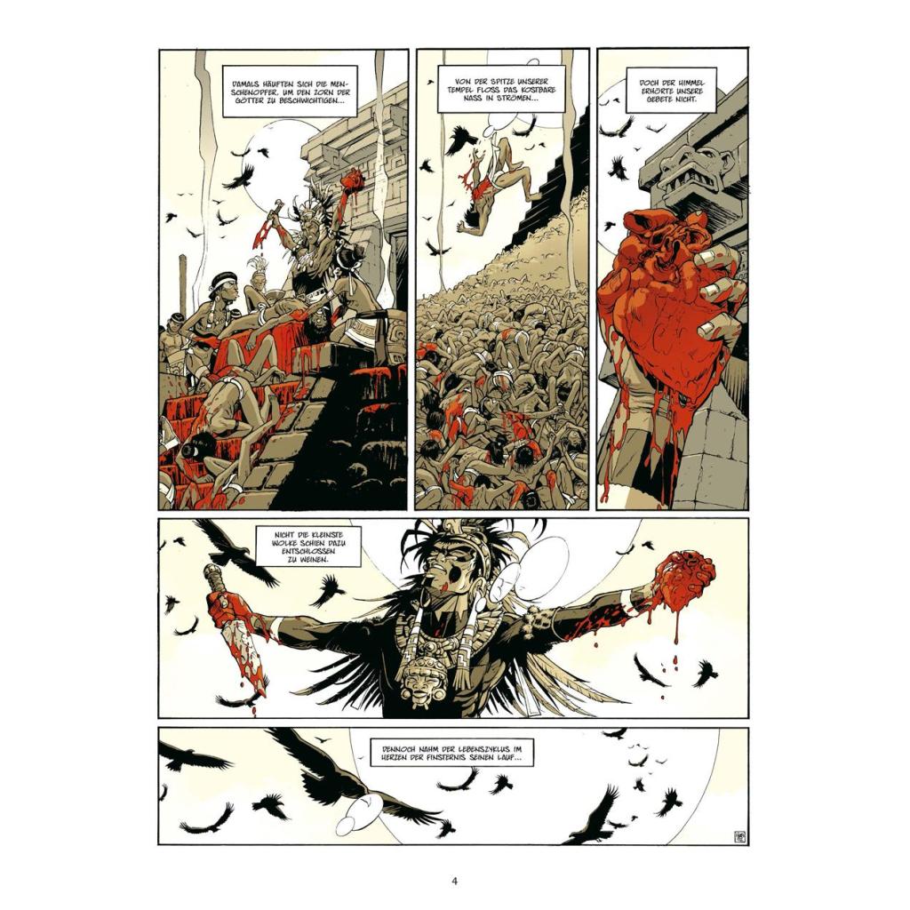 Die Bewohner Tenochtitlans sitzen zitternd vor Furcht in ihren Häusern, denn eine Serie grausamer Ritualmorde erschüttert die mächtige Hauptstadt des Aztekenreichs. Die Opfer ¿ allesamt junge Frauen ¿ tauchen in den Feldern außerhalb der Mauern auf, ausgeweidet, mumifiziert und mit kalkbemalten Gesichtern. Die besorgten Machthaber beauftragen ihren fähigsten Mann, genannt Schlange, mit der raschen Aufklärung der Morde. Währenddessen versucht Hohepriester Cozatl, seinen Jugendfreund Augen-Speer zu überreden, der Sache ebenfalls nachzugehen, und zwar schnell. Denn Schlanges Methoden sind nicht nur effektiv, sondern vor allem grausam¿ Nach dem mittelalterlichen Japan (»Okko«) und den Ländern der Wikinger (»Aslak«) erkundet Hub in diesem vielschichtigen Historienthriller das Aztekenreich.